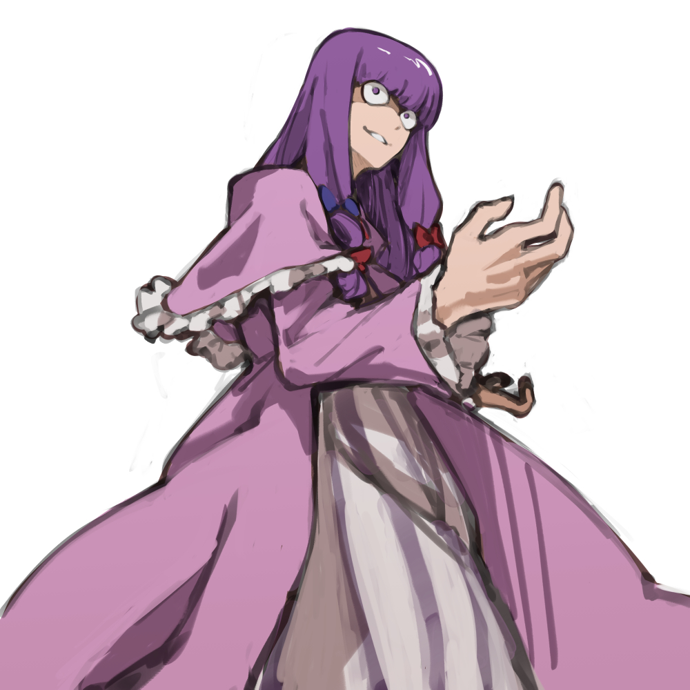 1girl blue_bow blunt_bangs bow commentary_request constricted_pupils cookie_(touhou) cowboy_shot dress frilled_sleeves frills grey_background grin hair_bow long_sleeves looking_at_viewer multiple_hair_bows patchouli_knowledge purple_dress purple_eyes purple_hair red_bow simple_background smile solo striped_clothes striped_dress taisa_(cookie) touhou vertical-striped_clothes vertical-striped_dress ym_(nicoseiga18386039)