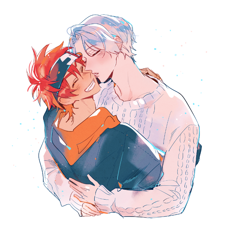 2boys arm_around_shoulder arms_around_another's_back blue_headband blush cable_knit closed_eyes grin hair_between_eyes hasegawa_langa headband hood hood_down hoodie hug katsura_(guiyuy) kiss kissing_cheek knit_sweater kyan_reki long_sleeves male_focus multicolored_hoodie multiple_boys orange_hood red_hair simple_background sk8_the_infinity smile sweater teeth white_background white_hair white_sweater yaoi