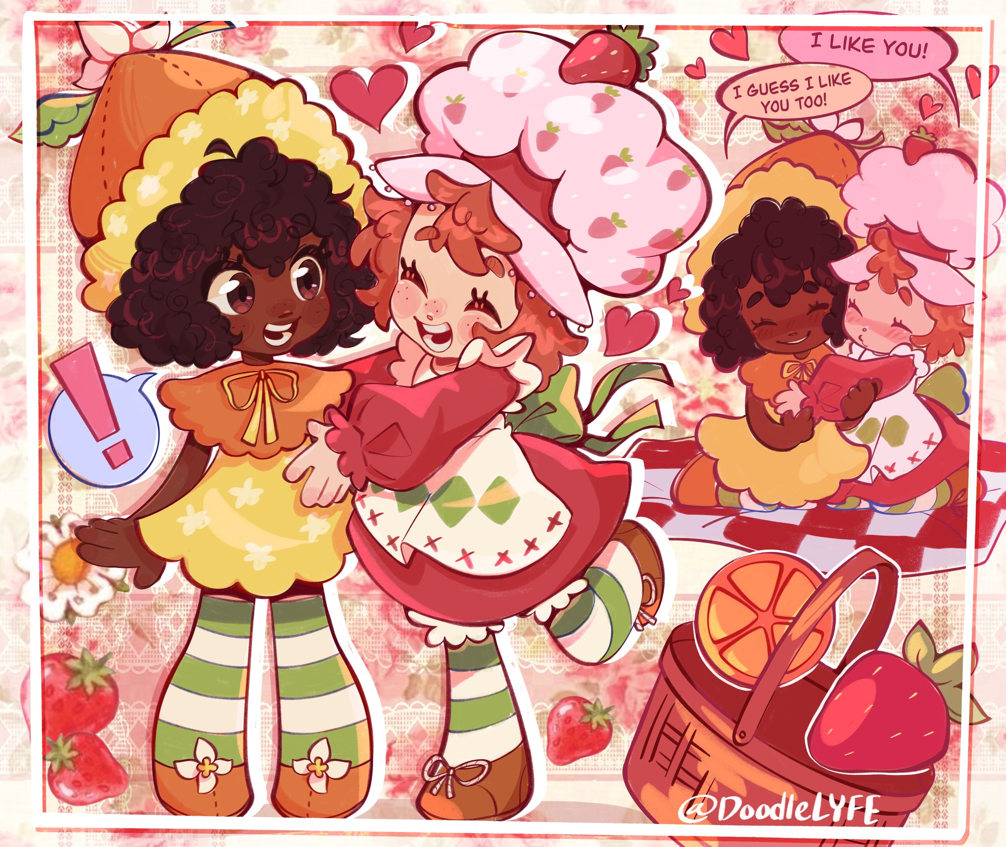 ! 2girls :d ^_^ afro ahoge apron basket bloomers brown_footwear brown_hair capelet closed_eyes commentary dark-skinned_female dark_skin deformed doodlelyfe dress english_commentary english_text facing_another flower food food_print footwear_flower footwear_ribbon freckles frilled_apron frilled_sleeves frills fruit fruit_print full_body fur-trimmed_headwear fur_trim green_pantyhose grin hair_between_eyes hat heart highres imminent_hug inset_border interracial long_sleeves looking_at_another multiple_girls multiple_views open_mouth orange_(fruit) orange_blossom_(sbsc) orange_capelet orange_dress orange_hat orange_shoes orange_slice pantyhose picnic_basket picnic_blanket pink_hat puffy_long_sleeves puffy_sleeves red_dress red_hair shoes short_hair smile speech_bubble spoken_exclamation_mark standing standing_on_one_leg star_(symbol) star_print strawberry_hat_ornament strawberry_print strawberry_shortcake_(1980s) strawberry_shortcake_(character) strawberry_shortcake_(series) striped_clothes striped_pantyhose teeth two-tone_pantyhose underwear very_dark_skin white_apron white_bloomers white_flower white_pantyhose yuri