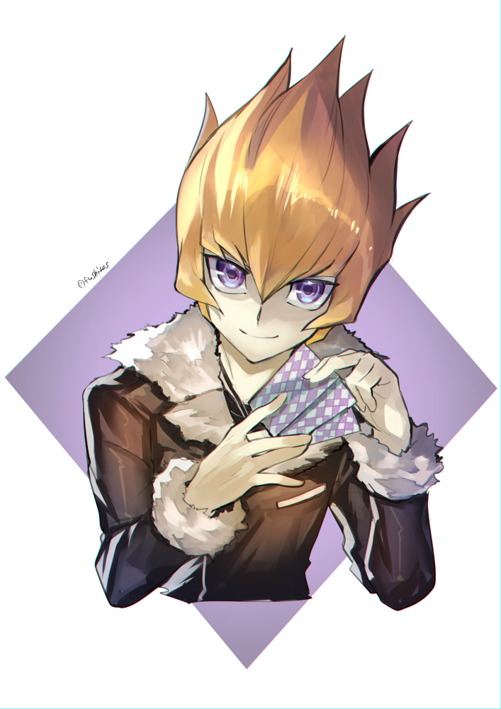 1boy black_jacket brown_hair card closed_mouth commentary_request cropped_torso fur-trimmed_jacket fur_trim fushitasu holding holding_card jacket long_sleeves male_focus purple_eyes short_hair smile solo spiked_hair vector_(yu-gi-oh!) yu-gi-oh! yu-gi-oh!_zexal
