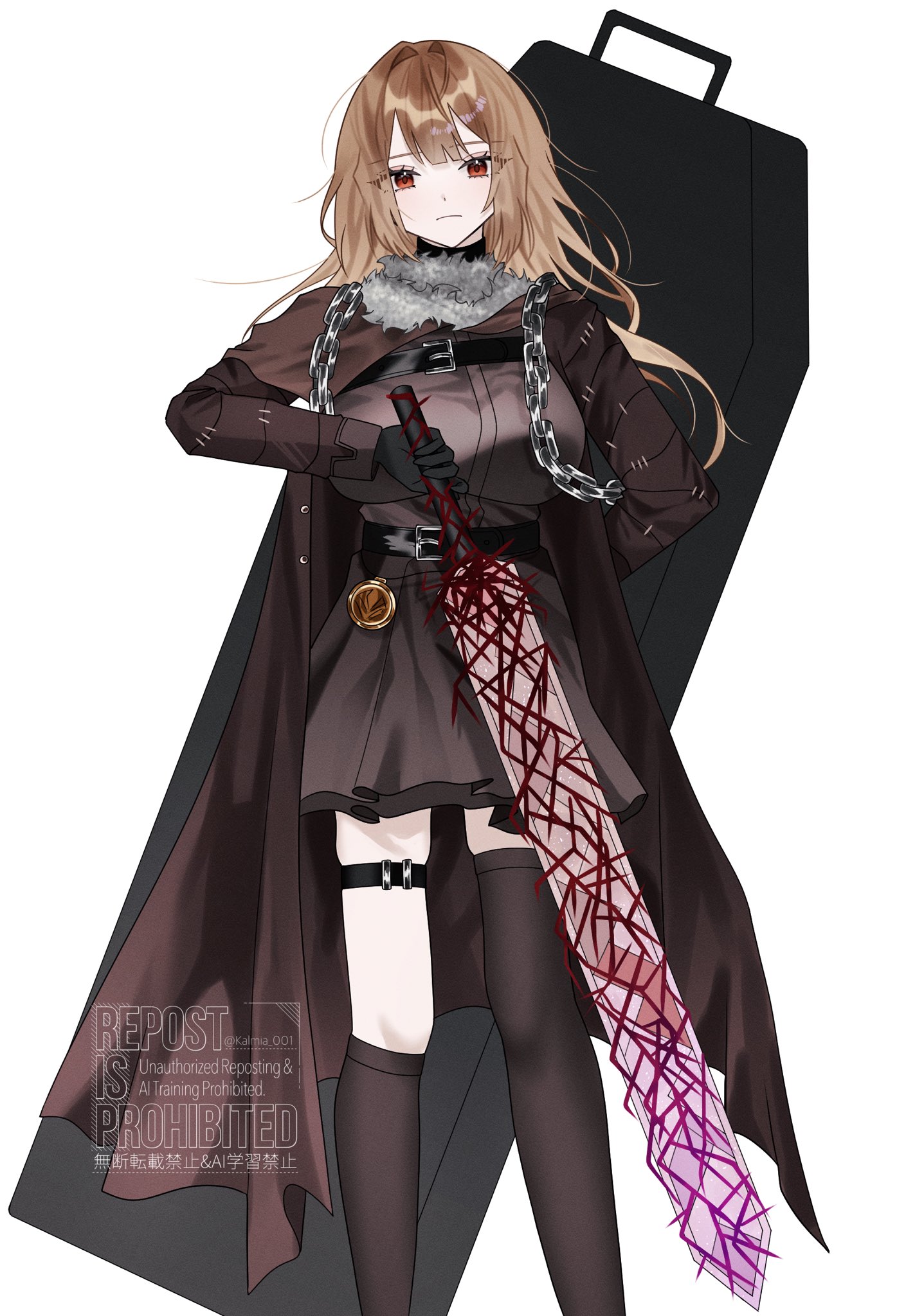 1girl arm_behind_back breasts brown_dress brown_eyes brown_hair brown_socks brown_thighhighs catherine_(project_moon) chest_harness closed_mouth coffin cosplay dress erlking_heathcliff_(project_moon) erlking_heathcliff_(project_moon)_(cosplay) feet_out_of_frame harness highres holding holding_sword holding_weapon kalmia001 kneehighs large_breasts limbus_company long_hair looking_at_viewer project_moon single_kneehigh single_sock single_thighhigh socks solo sword thighhighs weapon