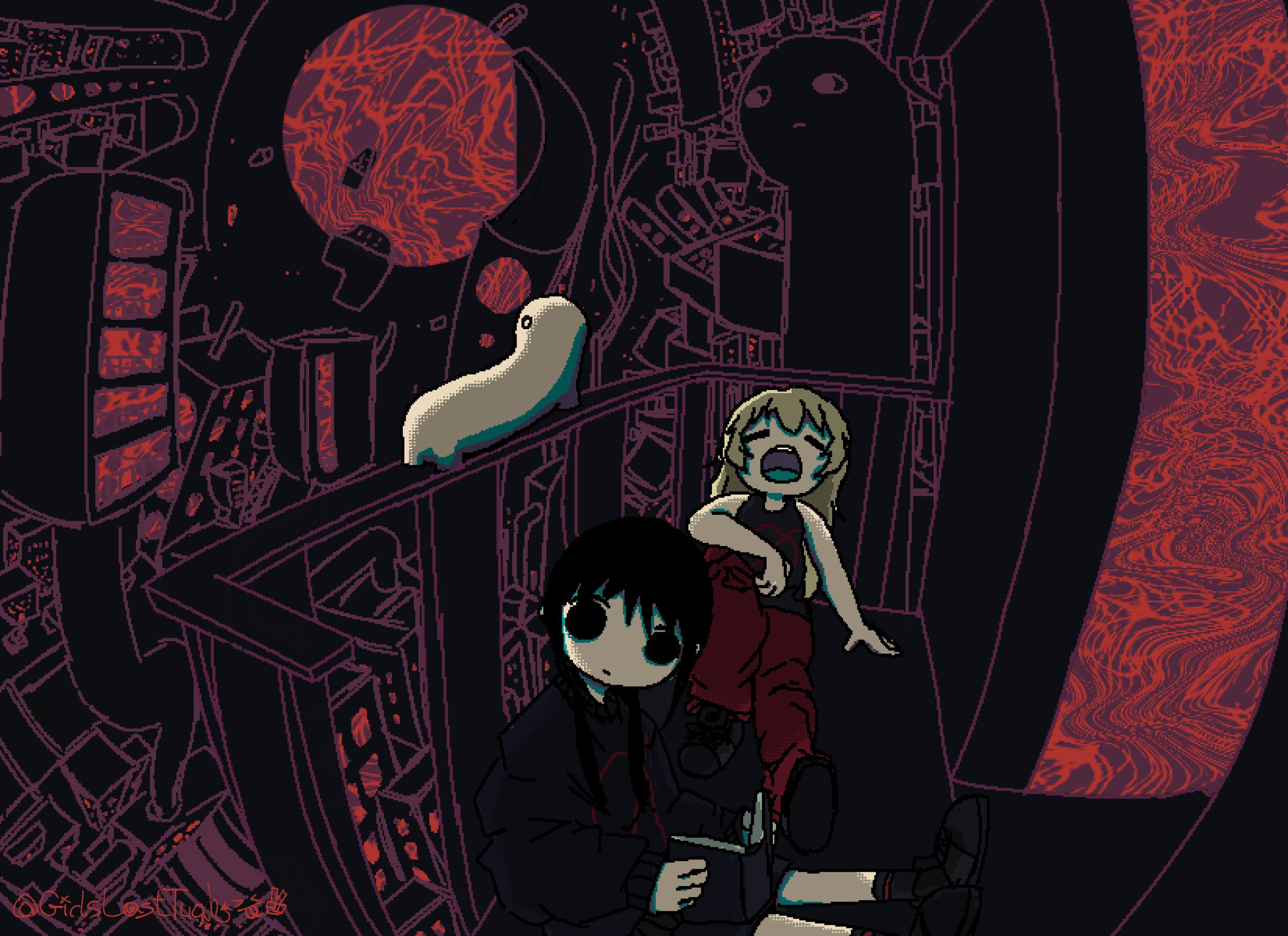 2girls abstract_background absurdres ankle_socks black_eyes black_hair black_socks black_sweater black_tank_top blonde_hair book cargo_pants chito_(shoujo_shuumatsu_ryokou) creature dithering fisheye full_body girlslasttuah highres holding holding_book jaggy_lines milk_inside_a_bag_of_milk_inside_a_bag_of_milk multiple_girls muted_color nuko_(shoujo_shuumatsu_ryokou) pants reading reclining red_pants shoujo_shuumatsu_ryokou sitting socks solid_circle_eyes sweater tank_top twitter_username yawning yuuri_(shoujo_shuumatsu_ryokou)