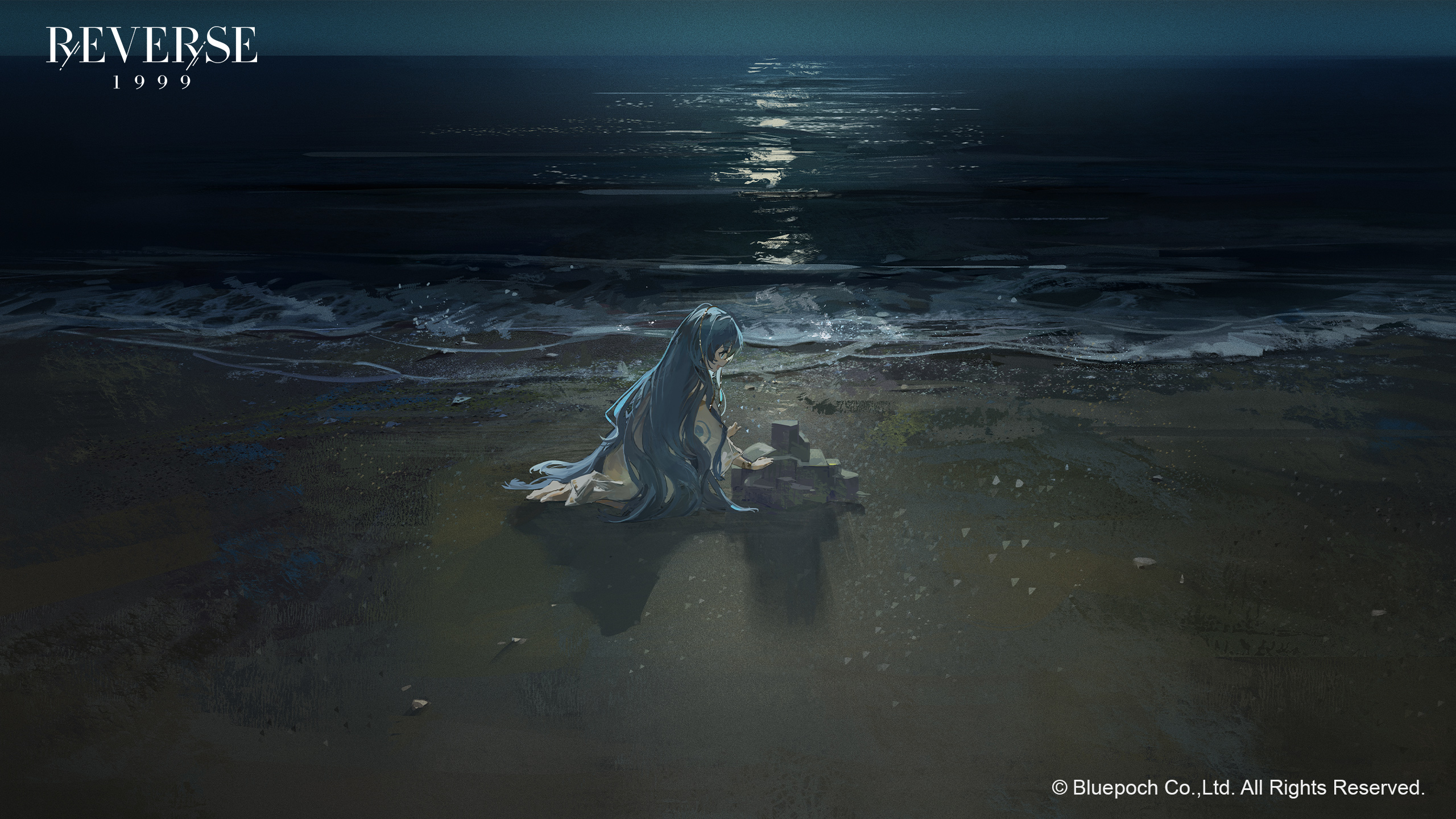 1girl 37_(reverse:1999) aged_down ancient_greek_clothes barefoot beach blue_eyes blue_hair building_sand_sculpture copyright_name copyright_notice greco-roman_clothes highres horizon kneeling logo long_hair moonlight night ocean official_art official_wallpaper open_mouth outdoors profile reverse:1999 sand sand_castle sand_sculpture shadow sky smile solo toga very_long_hair wide_shot