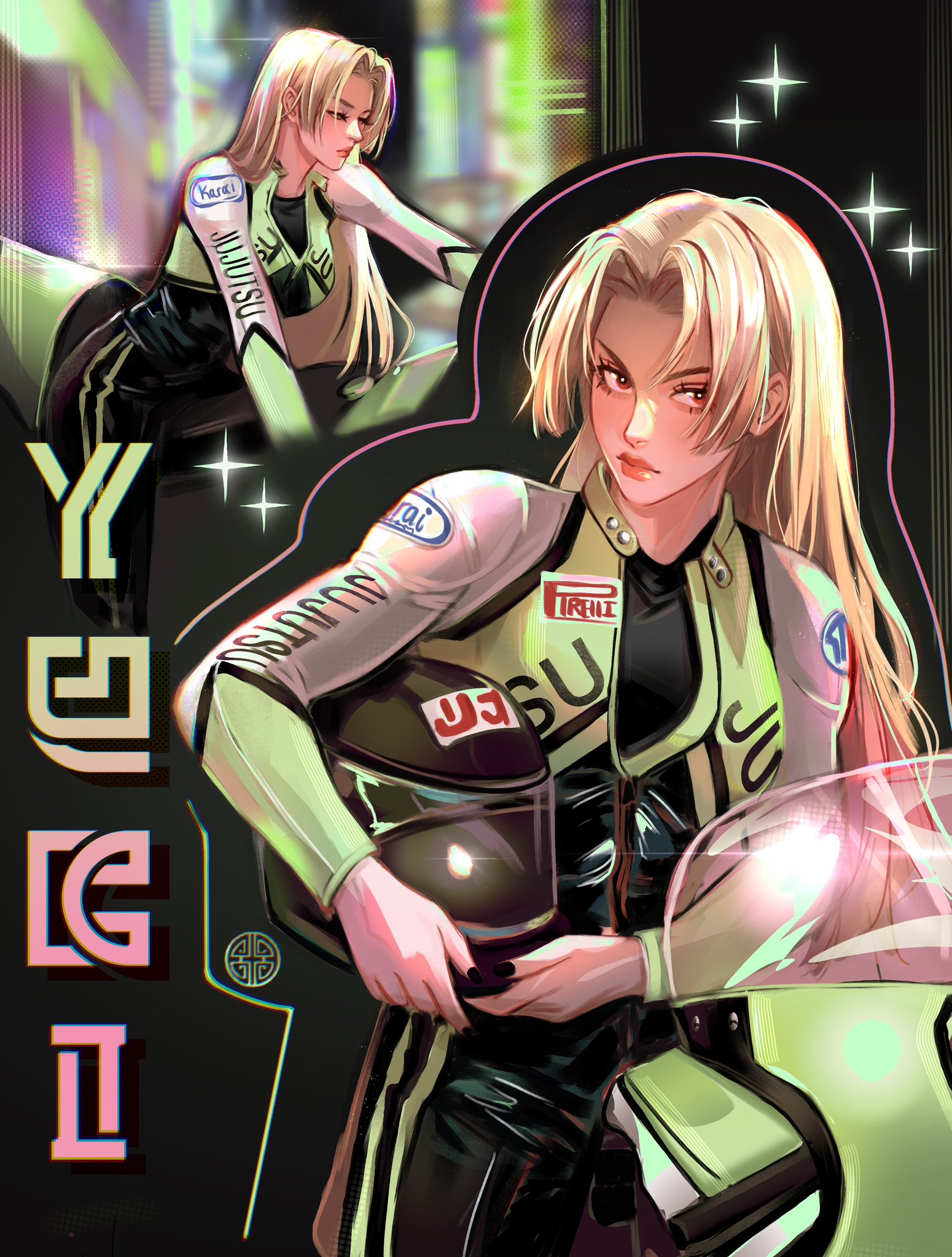 1girl biker_clothes bikesuit black_nails blonde_hair bodysuit bunnybelle22 character_name closed_mouth commentary cowboy_shot english_commentary eyelashes helmet highres holding holding_unworn_helmet jujutsu_kaisen long_hair motor_vehicle motorcycle multiple_views on_motorcycle parted_bangs pink_lips sparkle tsukumo_yuki_(jujutsu_kaisen) unworn_helmet