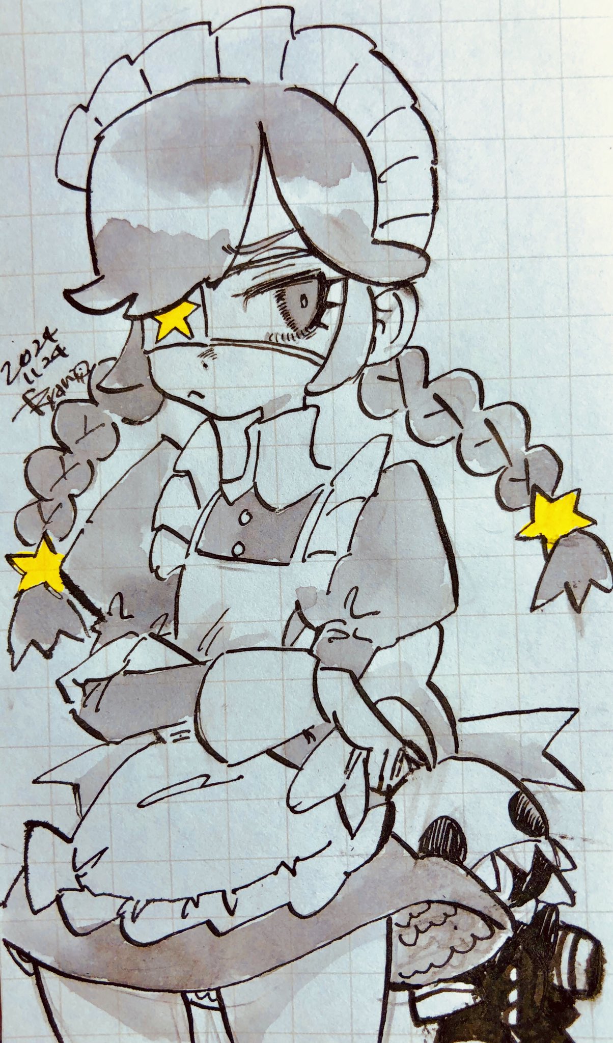 1girl alternate_costume annie_(skullgirls) apron ballpoint_pen_(medium) bloomers braid crossed_arms dress eyepatch frilled_apron frills frown highres juliet_sleeves long_sleeves looking_to_the_side maid_headdress pen_(medium) pout puffy_sleeves ryantoruhuhu sagan_(skullgirls) short_dress skullgirls solo traditional_media twin_braids underwear