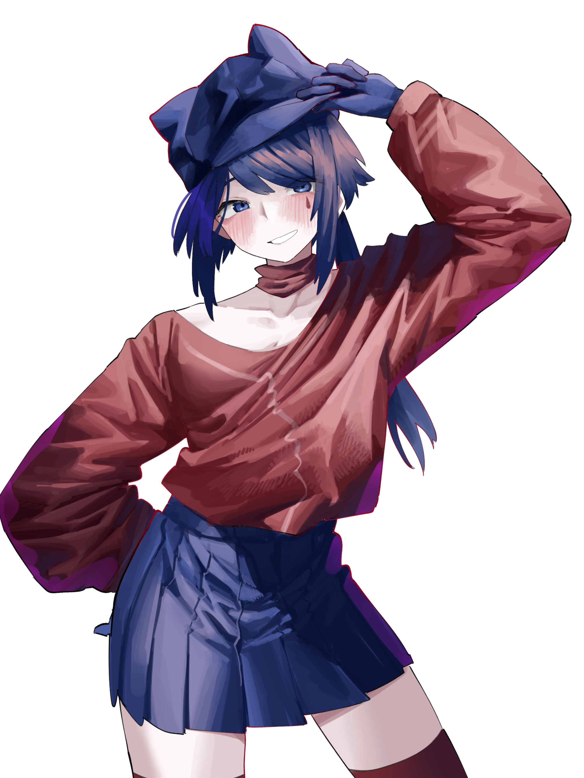 1girl absurdres animal_ear_headwear animal_ears arm_up blue_eyes blue_gloves blue_hair blue_hat blue_skirt blush choker collarbone commentary_request contrapposto cool_mita_(miside) cowboy_shot crop_top cropped_shirt facial_mark fake_animal_ears gloves hand_up hat highres long_hair long_sleeves looking_at_viewer low_ponytail miside mita_(miside) newsboy_cap pleated_skirt ponytail puffy_long_sleeves puffy_sleeves red_choker red_shirt red_thighhighs shirt simple_background skindentation skirt smile solo tattoo teardrop_facial_mark teardrop_tattoo thighhighs thighs vivo_(vivo_sun_0222) white_background zettai_ryouiki