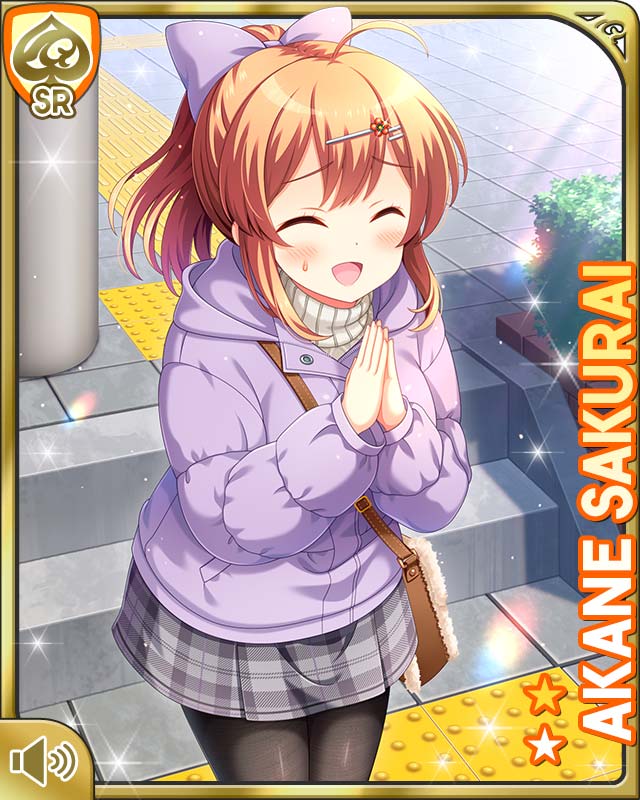 1girl :d black_leggings brown_eyes brown_hair card_(medium) closed_eyes day girlfriend_(kari) grey_skirt hair_ornament indoors jacket leggings looking_at_viewer official_art open_clothes open_mouth plaid_clothes plaid_skirt pleated_skirt ponytail purple_jacket qp:flapper sakurai_akane_(girlfriend_(kari)) skirt smile standing sweater white_sweater window