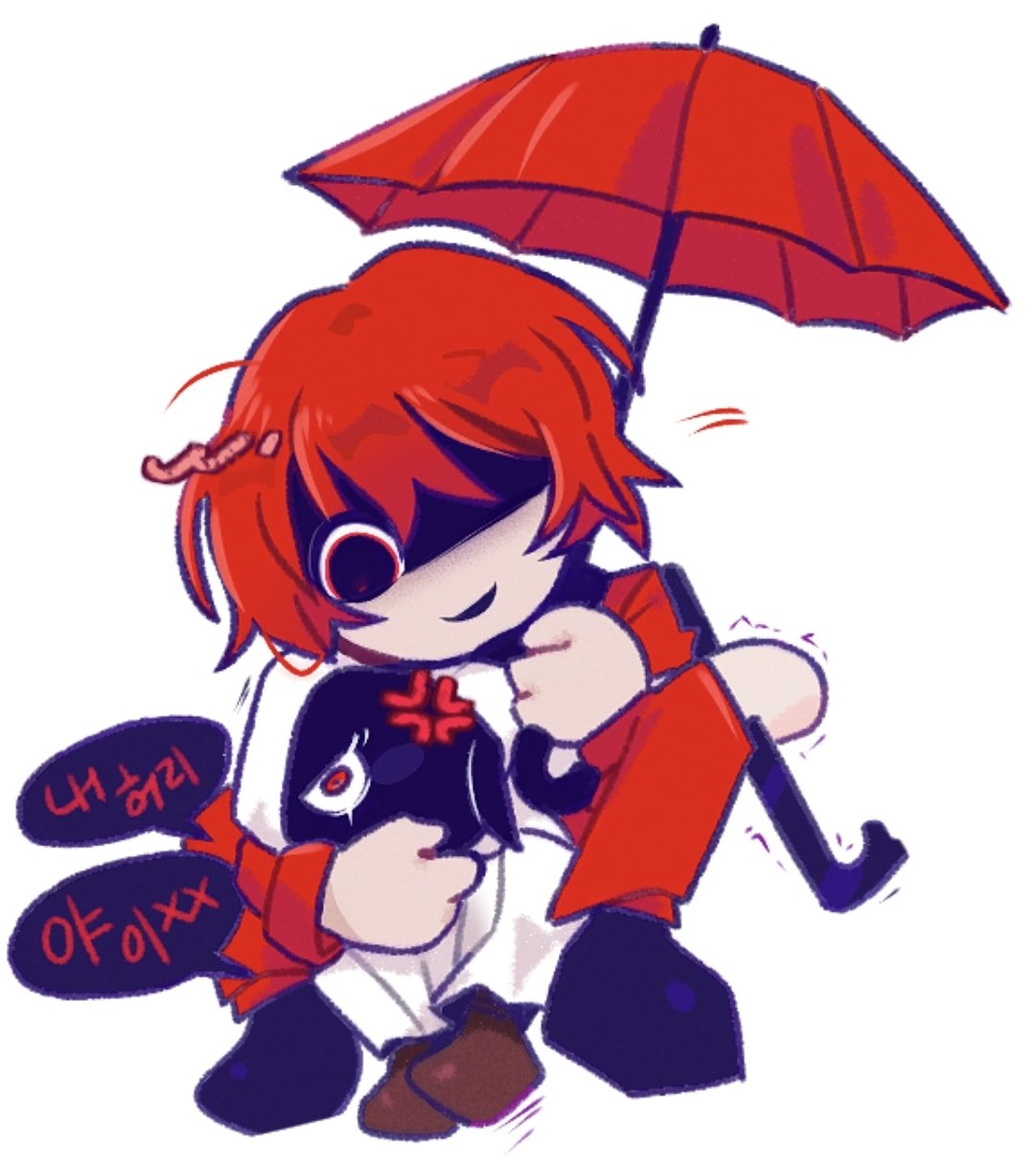 1boy 1girl anger_vein blueskyuup chibi coat commentary_request dilated_pupils full_body adashino_adami highres holding holding_umbrella homicipher korean_commentary korean_text mr._scarletella raincoat red_coat red_eyes red_hair red_umbrella short_hair simple_background sitting translation_request umbrella white_background