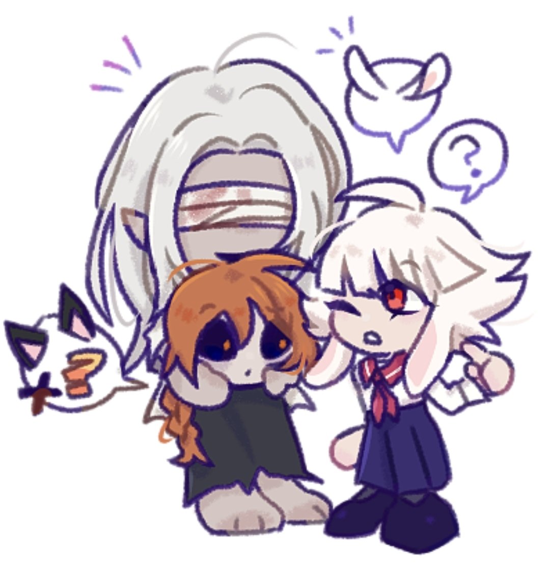 1girl 2boys bandages bandages_over_eyes black_sclera blueskyuup braid chibi colored_sclera commentary english_commentary full_body adashino_adami holding_detached_head homicipher long_hair mr._chopped mr._silvair multiple_boys orange_eyes orange_hair pointy_ears red_eyes school_uniform serafuku severed_head short_hair simple_background skirt white_background white_hair
