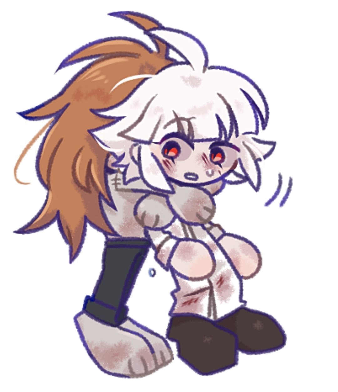 1boy 1girl blood blood_on_clothes blueskyuup blush chibi commentary_request crying full_body adashino_adami highres homicipher hug hug_from_behind korean_commentary long_hair looking_at_another mr._chopped orange_hair raincoat red_eyes short_hair simple_background stitches topless_male white_background white_hair