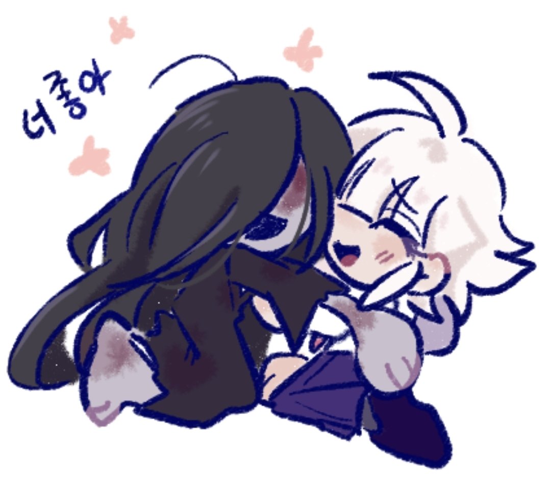 1boy 1girl black_hair black_kimono blood blood_on_face blueskyuup chibi closed_eyes commentary_request happy_aura adashino_adami homicipher hug japanese_clothes kimono korean_commentary korean_text long_hair mr._crawling school_uniform serafuku short_hair translation_request very_long_hair white_background white_hair