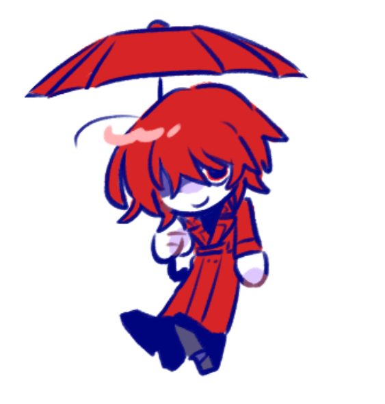 1boy blueskyuup chibi coat full_body holding holding_umbrella homicipher male_focus mr._scarletella red_coat red_eyes red_hair red_umbrella short_hair simple_background solo umbrella white_background