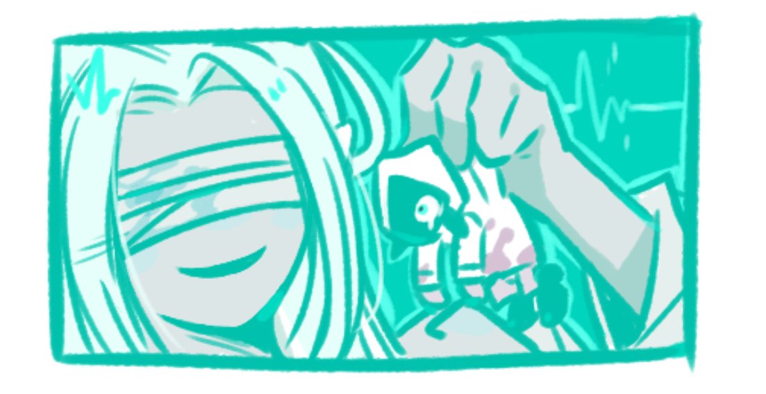 1boy 1girl bandages bandages_over_eyes blood blood_on_clothes bloody_bandages blue_theme blueskyuup cardiogram adashino_adami holding holding_mini_person homicipher long_hair looking_at_another mini_person minigirl mr._silvair pointy_ears raincoat