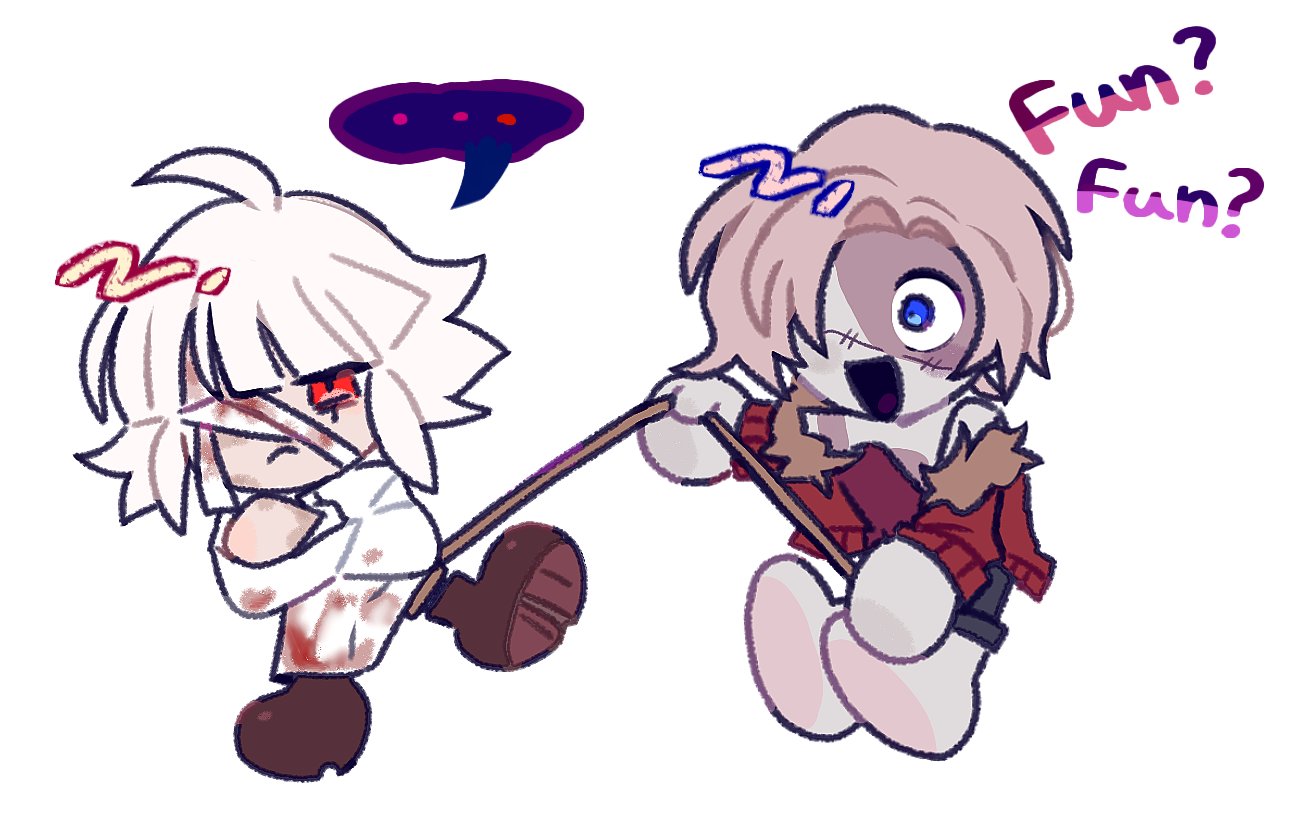 ... 1boy 1girl bandage_over_one_eye bandages blood bloody_bandages blue_eyes blueskyuup chibi commentary_request crossed_arms english_text adashino_adami homicipher jacket korean_commentary looking_at_another mr._stitch pink_hair raincoat red_eyes red_jacket rope short_hair spoken_ellipsis stitches white_hair