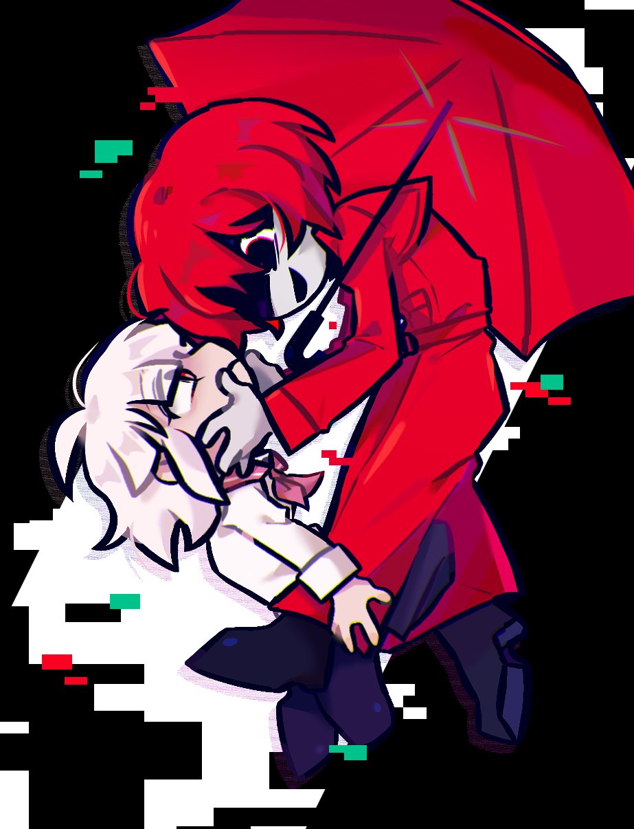 1boy 1girl black_background blueskyuup coat commentary_request glitch head_grab adashino_adami highres holding holding_umbrella homicipher korean_commentary looking_at_another mr._scarletella red_coat red_eyes red_hair red_umbrella school_uniform serafuku short_hair umbrella white_hair
