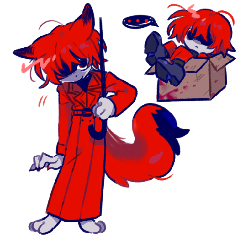 1boy blueskyuup box claws commentary_request fox_boy furrification furry furry_male holding holding_umbrella homicipher in_box in_container kemonomimi_mode korean_commentary looking_at_viewer male_focus mr._scarletella multiple_views red_eyes red_hair red_theme short_hair simple_background tail umbrella white_background