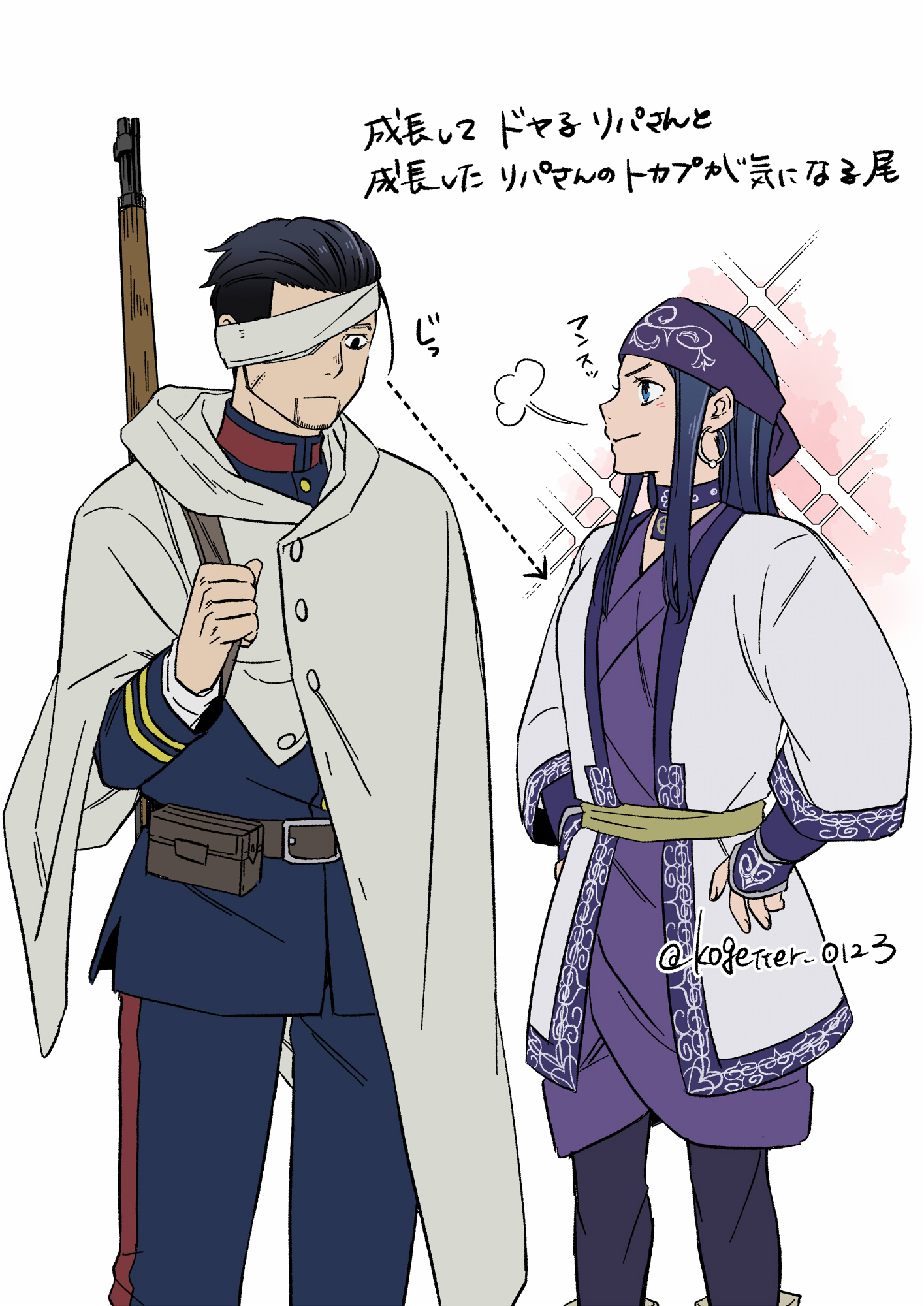 1boy 1girl aged_up ainu_clothes asirpa black_eyes black_hair breasts cloak commentary_request eyepatch facial_hair facial_scar goatee golden_kamuy gun gun_on_back hands_on_own_hips headband highres holding holding_gun holding_weapon hood hooded_cloak hoop medium_breasts military_uniform moonlight_0423 ogata_hyakunosuke pouch purple_headband rifle scar scar_on_cheek scar_on_face translation_request twitter_username weapon weapon_on_back