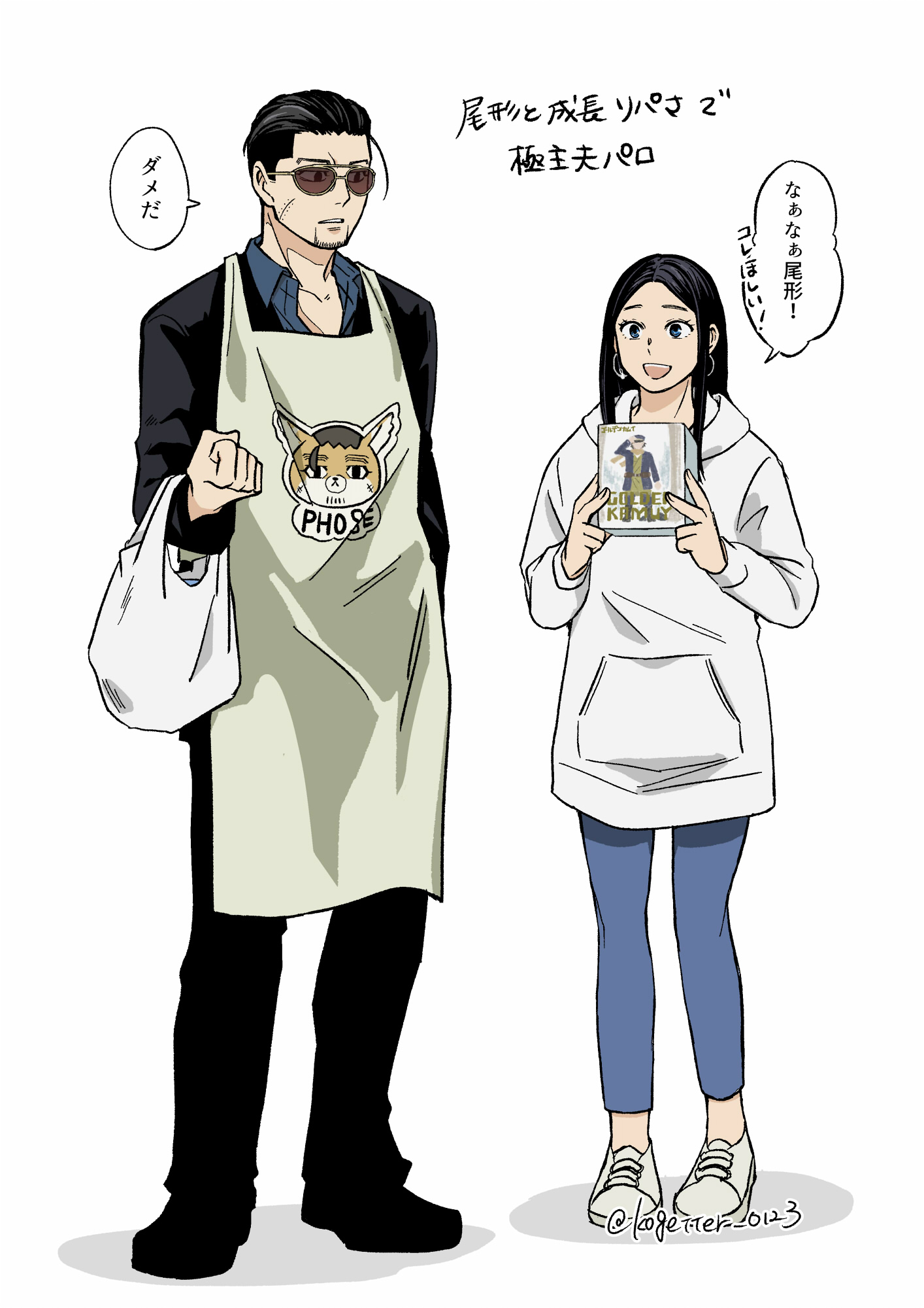 1boy 1girl apron asirpa asymmetrical_hair bag brown_apron commentary_request contemporary cosplay earrings facial_hair facial_scar goatee gokushufudou golden_kamuy hair_slicked_back highres holding holding_bag hood hooded_sweater hoodie hoop_earrings jewelry meta moonlight_0423 ogata_hyakunosuke open_mouth plastic_bag scar scar_on_cheek scar_on_face sidecut smile sunglasses sweater tatsu_(gokushufudou) tatsu_(gokushufudou)_(cosplay) translation_request undercut white_hoodie white_sweater