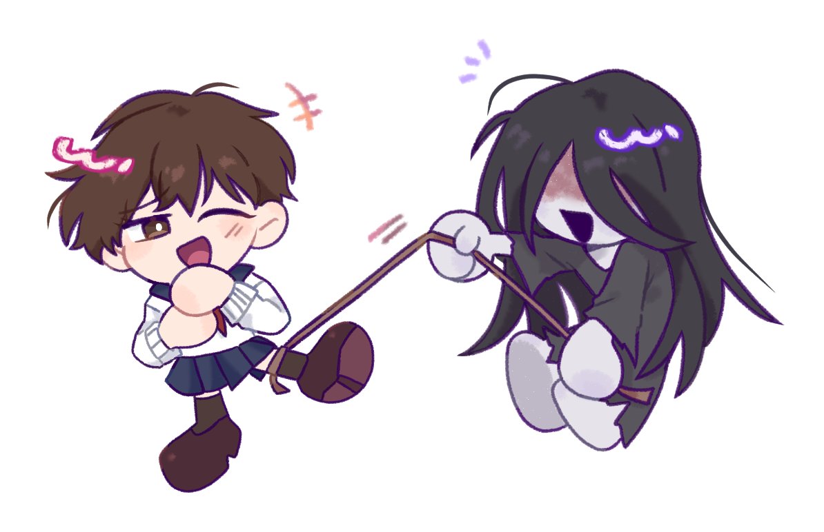 1boy 1girl black_hair black_kimono blood blood_on_face blueskyuup borrowed_character brown_eyes brown_hair chibi commentary_request full_body homicipher japanese_clothes kimono korean_commentary long_hair mr._crawling rope school_uniform serafuku short_hair simple_background white_background