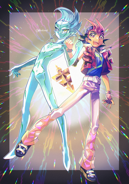 2boys astral_(yu-gi-oh!) black_border blue_shirt blue_skin border colored_skin full_body fushitasu grey_eyes heterochromia jacket jewelry looking_at_viewer male_focus multiple_boys necklace open_mouth pants pointy_ears red_jacket shirt teeth tsukumo_yuma white_pants yellow_eyes yu-gi-oh! yu-gi-oh!_zexal