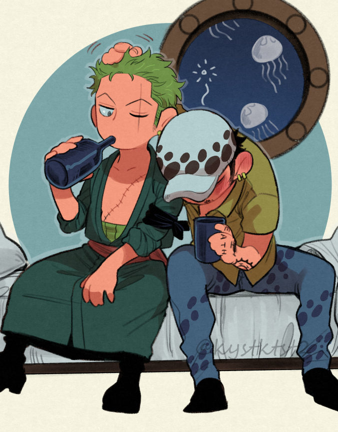 2boys bed blue_pants collarbone drinking drunk earrings green_hair hand_on_another's_head hat jellyfish jewelry kiyoshita long_sideburns male_focus multiple_boys one_eye_closed one_piece pants roronoa_zoro scar scar_across_eye scar_on_face sideburns sitting stitched_torso stitches trafalgar_law white_hat