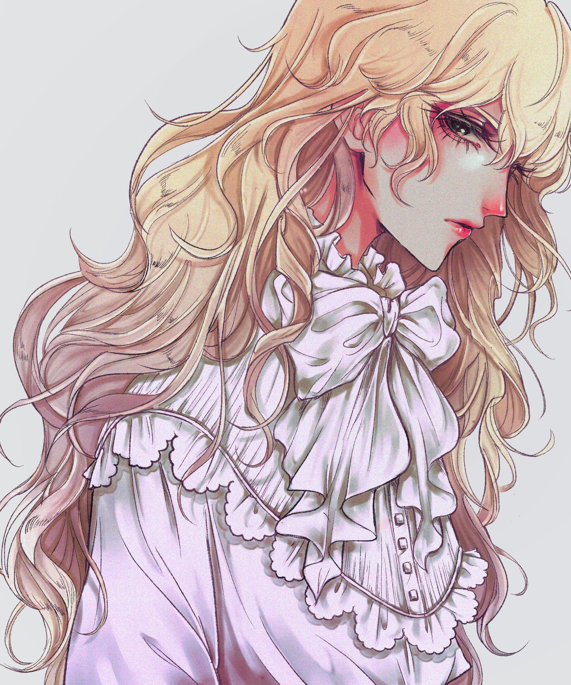 1boy arion_rosemarine bishounen blonde_hair bow bowtie frilled_shirt frills from_side hago_46 highres kaze_to_ki_no_uta long_hair looking_at_viewer shirt simple_background solo trap very_long_hair white_bow white_bowtie white_shirt
