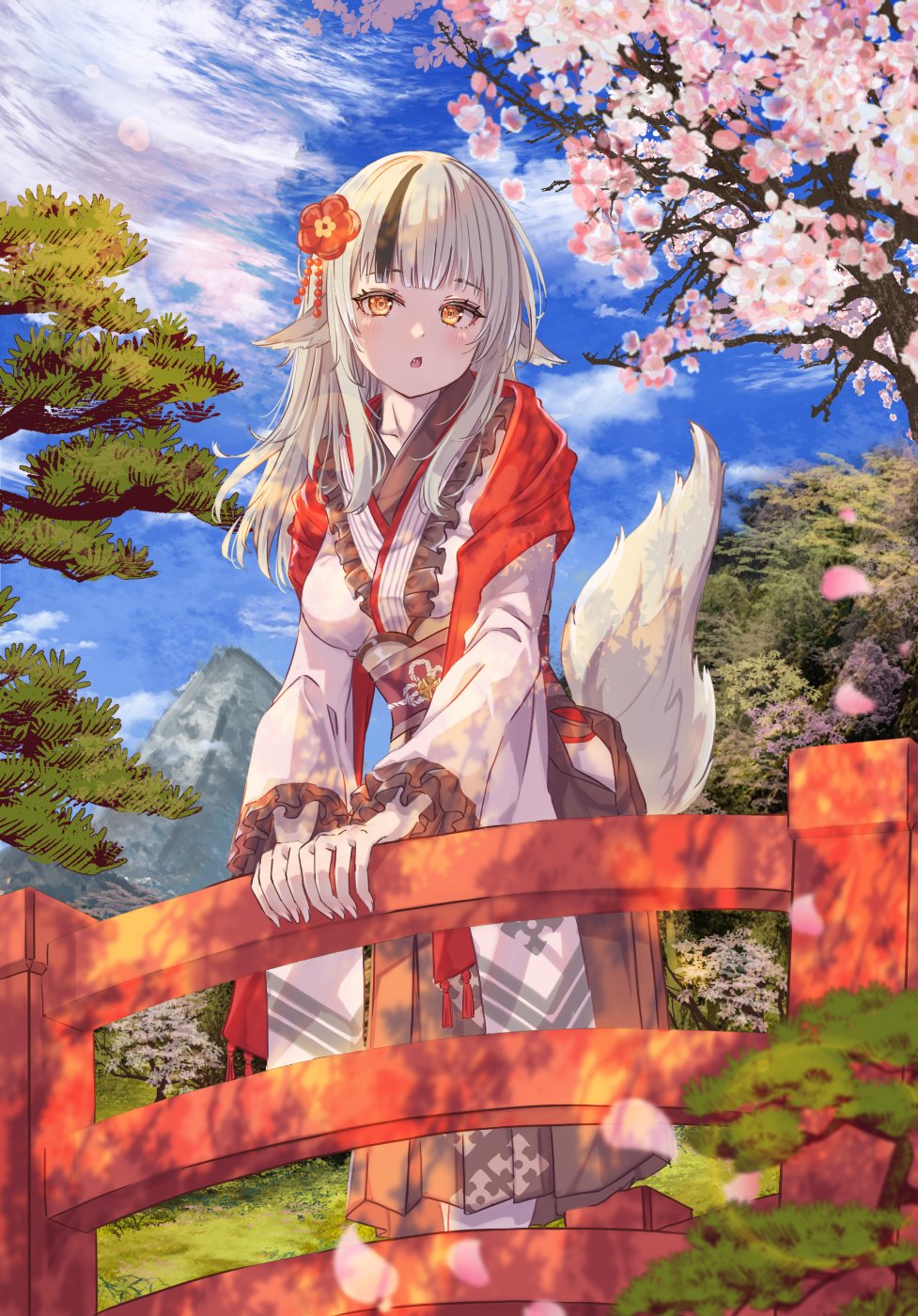 1girl animal_ears breasts cherry_blossoms collarbone fang fire_emblem fire_emblem_fates fire_emblem_heroes flower frilled_kimono frills fuussu_(21-kazin) gradient_clothes grey_hair grey_tail hair_flower hair_ornament highres japanese_clothes kimono medium_breasts multicolored_hair nintendo official_alternate_costume open_mouth solo standing streaked_hair tail two-tone_hair two-tone_kimono velouria_(fire_emblem) velouria_(new_year)_(fire_emblem) wide_sleeves wolf_ears wolf_girl wolf_tail yellow_eyes