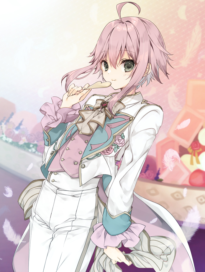 1boy ahoge blurry blurry_background bow bowtie buttons closed_mouth cowboy_shot double-breasted ensemble_stars! falling_feathers feathers fingernails frilled_sleeves frills green_eyes grey_bow grey_bowtie hair_between_eyes hand_up heart himemiya_tori holding inugami_kira long_sleeves looking_at_viewer male_focus pants pink_hair pink_vest short_hair short_hair_with_long_locks smile solo standing straight_hair tailcoat trap vest white_pants