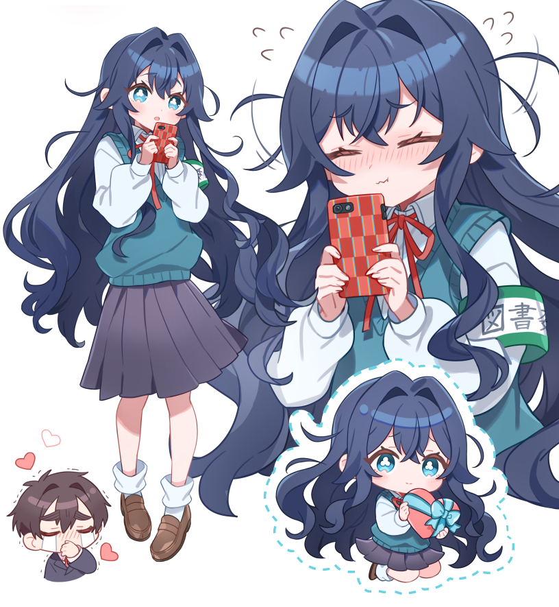 1boy 1girl :o aijou_rentarou ankle_socks armband black_hair blazer blue_eyes blue_hair blue_jacket blue_skirt blue_sweater_vest blush box brown_shoes cellphone chibi chibi_inset closed_eyes closed_mouth collared_shirt commentary_request cropped_torso crossed_bangs crying double-parted_bangs flying_sweatdrops full_body furrowed_brow green_armband hair_between_eyes hair_intakes hand_to_own_mouth heart-shaped_box holding holding_phone jacket kanyoko_(yuzukano_17) kimi_no_koto_ga_dai_dai_dai_dai_daisuki_na_100-nin_no_kanojo loafers long_hair long_sleeves looking_at_viewer neck_ribbon ohananomitsu_high_school_uniform parted_lips phone pleated_skirt puffy_long_sleeves puffy_sleeves raised_eyebrows red_ribbon ribbon school_uniform shirt shoes short_hair simple_background skirt smartphone socks standing streaming_tears sweater_vest tears very_long_hair wavy_hair wavy_mouth white_background white_shirt white_socks yoshimoto_shizuka
