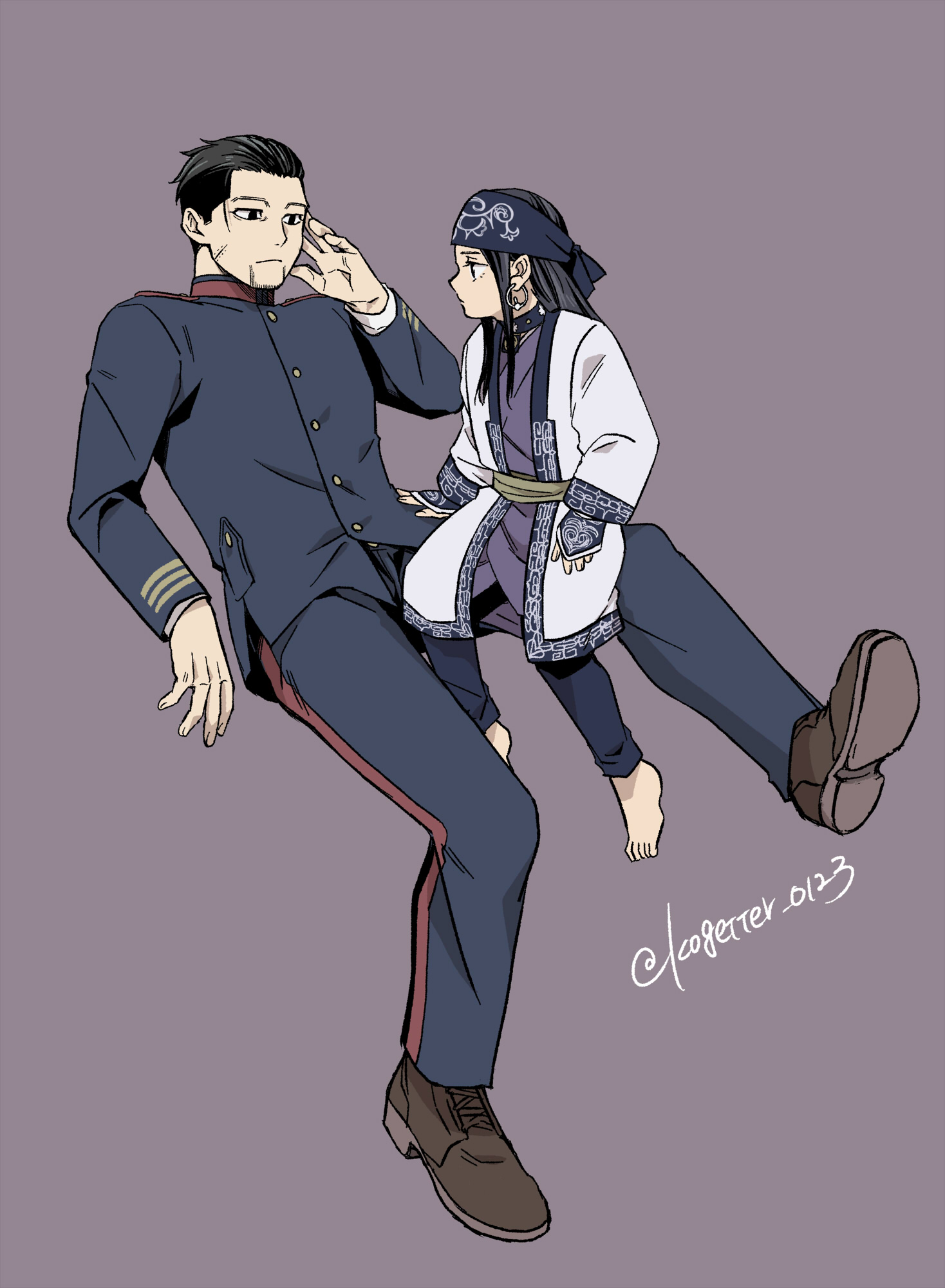1boy 1girl ainu_clothes asirpa asymmetrical_hair barefoot black_eyes black_hair blue_headband commentary_request earrings facial_hair facial_scar frown goatee golden_kamuy headband highres hoop_earrings jewelry military_uniform moonlight_0423 ogata_hyakunosuke scar scar_on_cheek scar_on_face sidecut sleeves_past_wrists twitter_username undercut