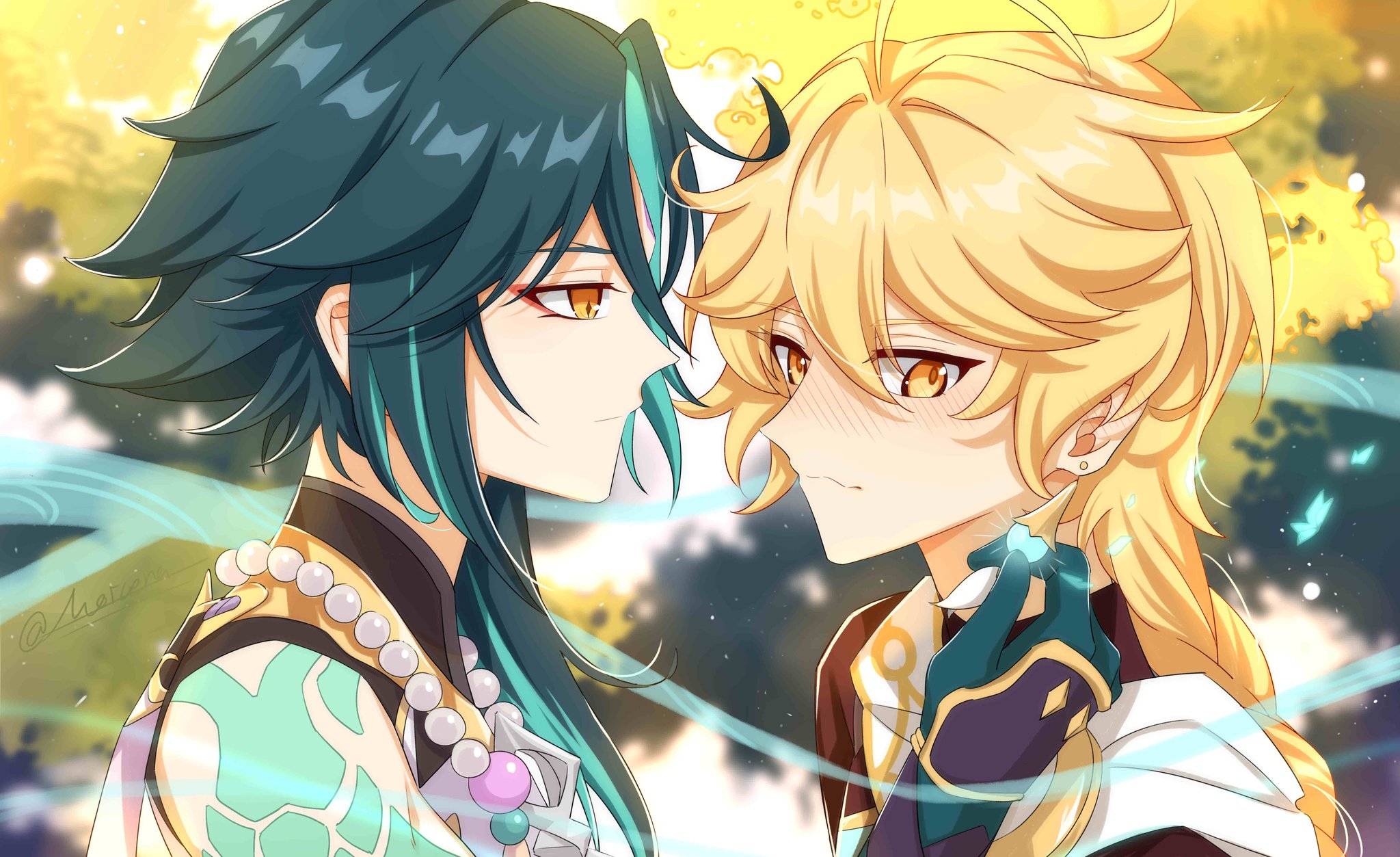 2boys aether_(genshin_impact) ahoge arm_tattoo blonde_hair blue_hair braid braided_ponytail earrings genshin_impact gloves hashtag-only_commentary highres holding_earrings jewelry long_hair looking_to_the_side male_focus moicena1 multicolored_hair multiple_boys necklace tattoo two-tone_hair upper_body wind xiao_(genshin_impact) yaoi yellow_eyes
