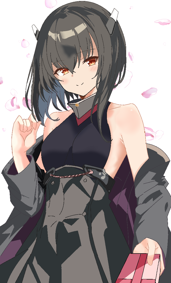 1girl alternate_hair_color black_hair box box_of_chocolates breasts closed_mouth headgear kantai_collection looking_at_viewer medium_hair off_shoulder red_eyes sleeveless small_breasts smile solo taihou_(kancolle) valentine yamacoro