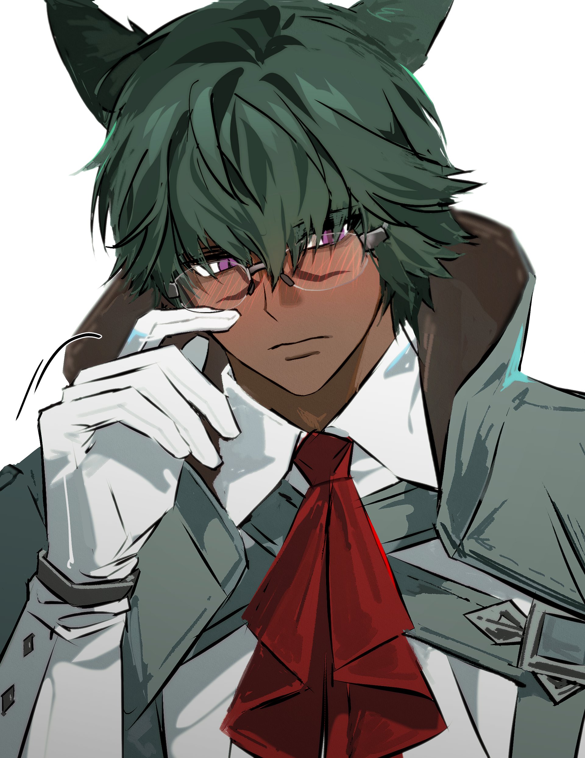 1boy absurdres animal_ears ascot belt blush chest_belt collared_shirt commentary_request dark-skinned_male dark_skin final_fantasy final_fantasy_xiv frown glasses gloves green_hair grey_belt grey_jacket high_collar highres jacket koana_(ff14) korean_commentary long_sleeves looking_to_the_side male_focus miqo'te popped_collar purple_eyes red_ascot rimless_eyewear shirt short_hair sideways_glance simple_background solo upper_body white_background white_gloves white_shirt wing_collar yooonggun