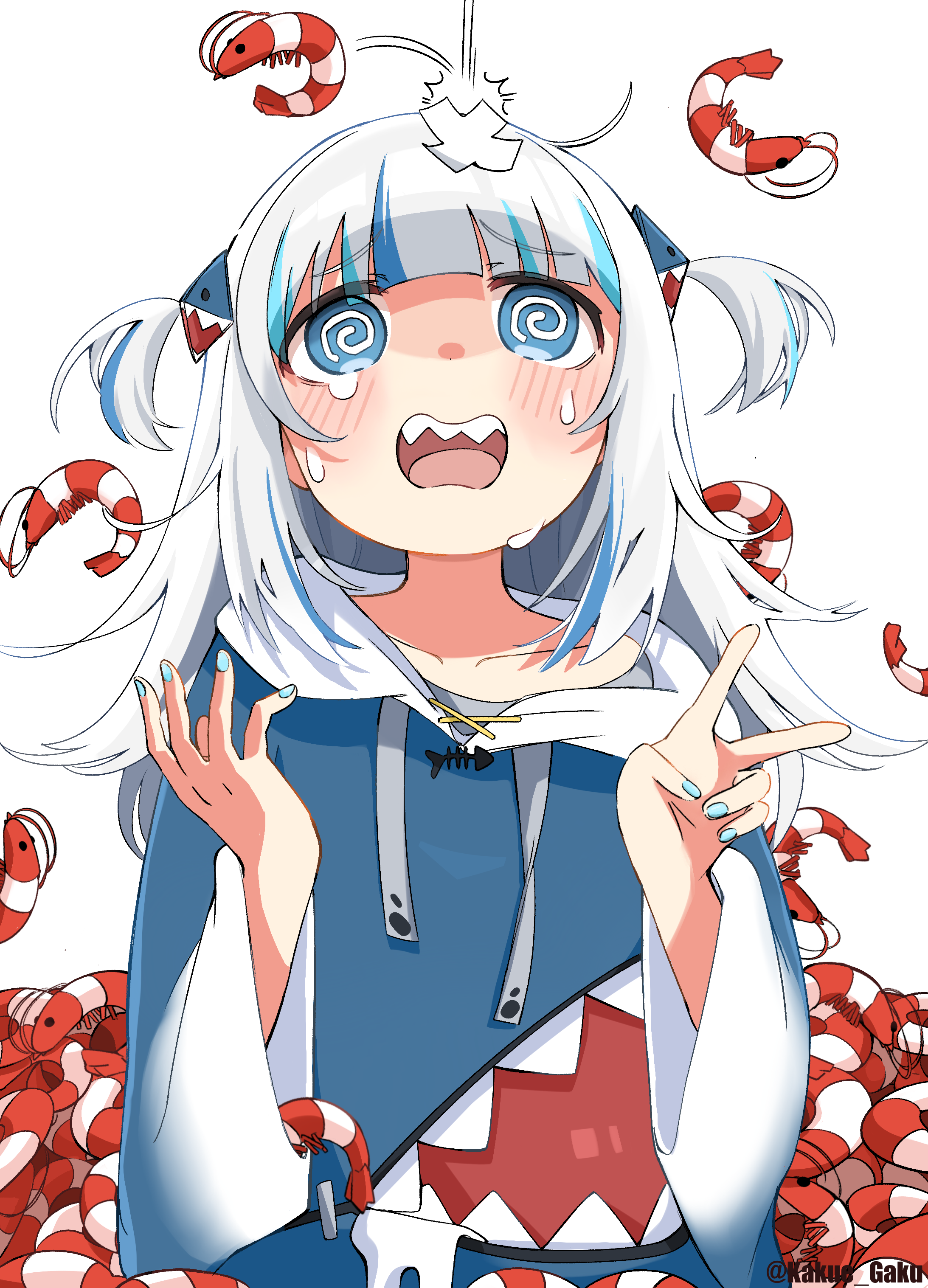 1girl @_@ absurdres bandaid bandaid_on_head blue_eyes blue_hair blue_hoodie blue_nails blunt_bangs blush collarbone commentary crying drawstring gawr_gura gawr_gura_(1st_costume) hair_ornament highres hololive hololive_english hood hood_down hoodie kakue_gaku long_hair long_sleeves multicolored_hair nail_polish open_mouth shark_hair_ornament sharp_teeth shrimp solo streaked_hair untranslatable_commentary tears teeth transparent_background twitter_username two_side_up upper_body v virtual_youtuber white_hair wide_sleeves