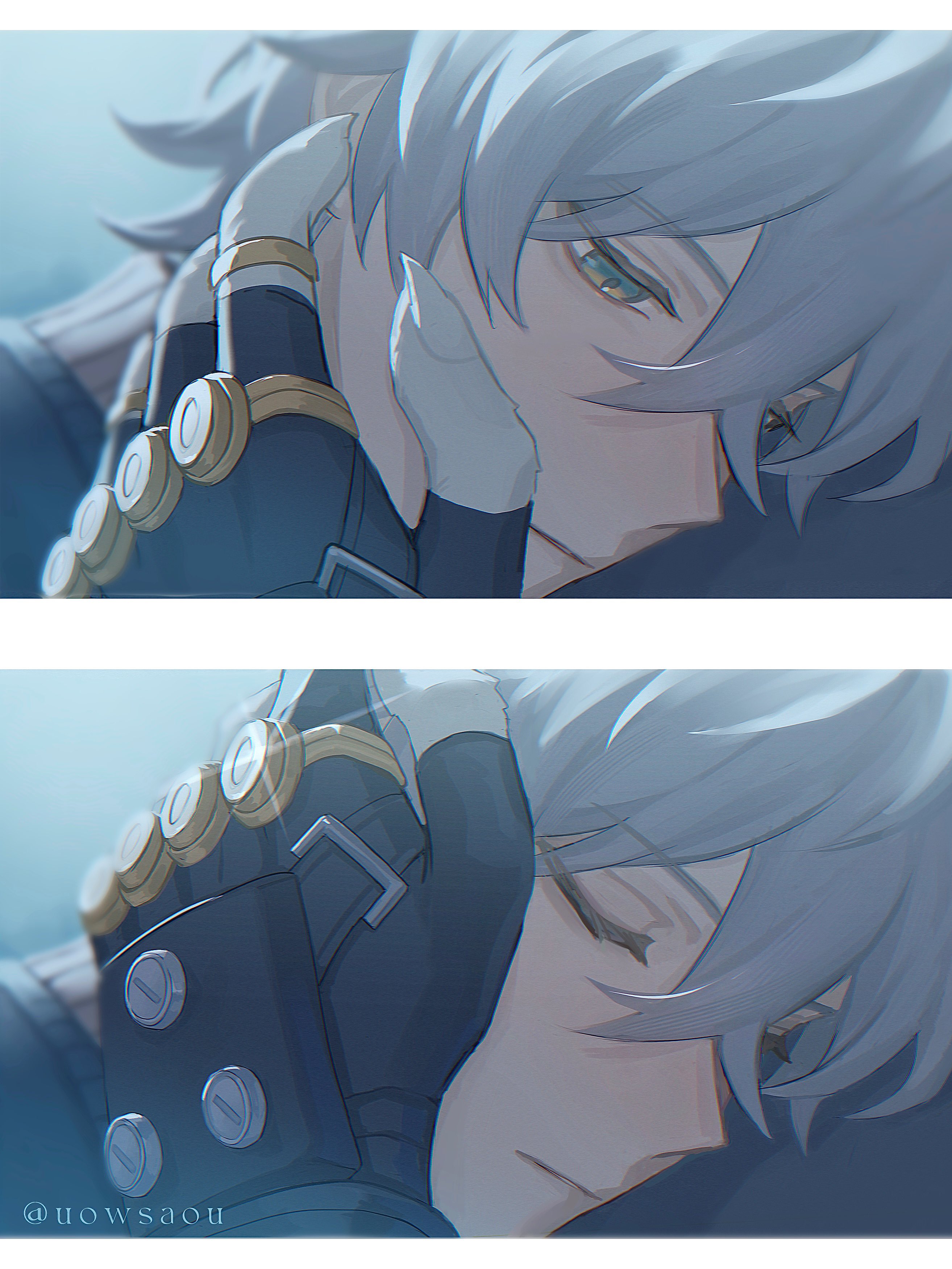2boys absurdres black_gloves close-up closed_eyes commentary couple fingerless_gloves gloves grey_eyes grey_hair grey_sky hand_on_another's_cheek hand_on_another's_face highres lens_flare male_focus multiple_boys sky twitter_username uowsaou von_lycaon wise_(zenless_zone_zero) yaoi zenless_zone_zero