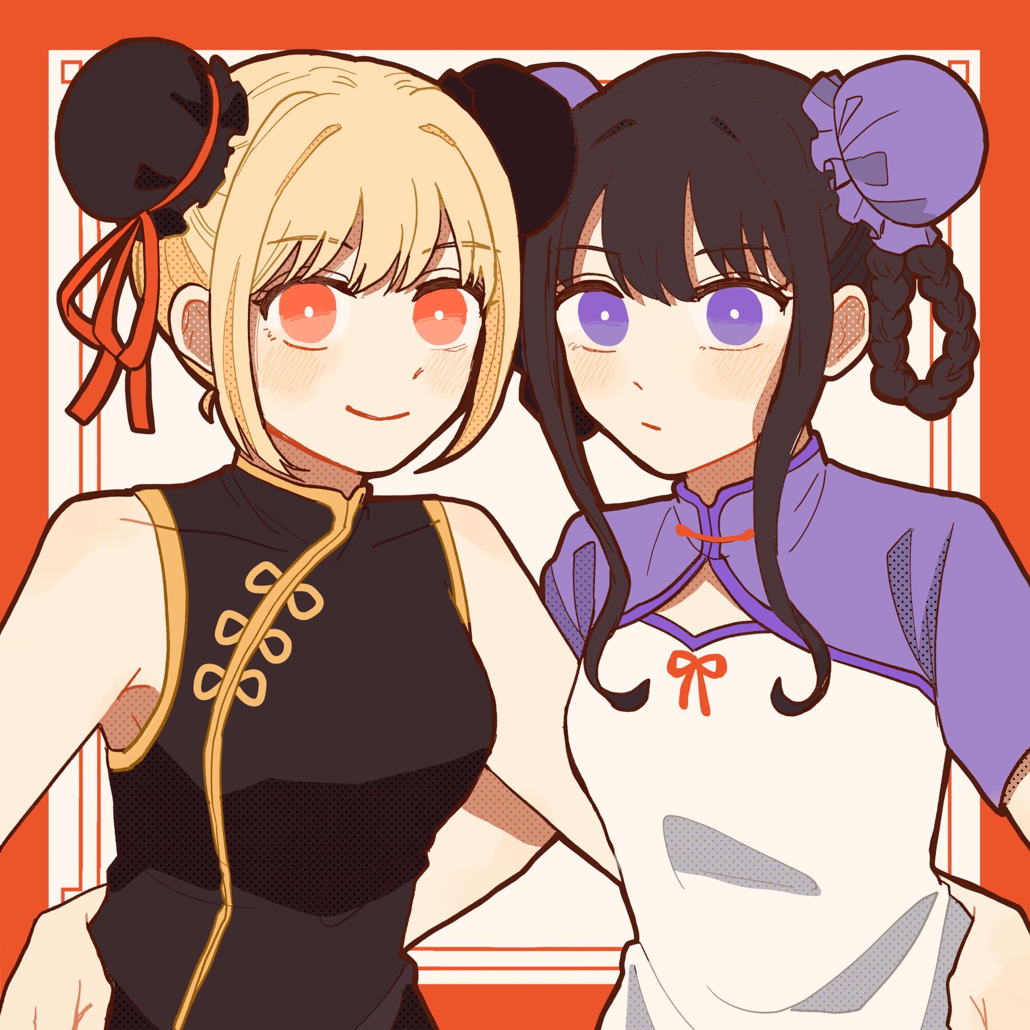 2girls alternate_costume bad_id bad_twitter_id black_dress black_hair blonde_hair breasts bun_cover china_dress chinese_clothes closed_mouth clothing_cutout commentary_request double_bun dress hair_bun highres inoue_takina kuro_gomaa looking_at_viewer lycoris_recoil medium_breasts multiple_girls nishikigi_chisato purple_eyes red_eyes short_hair sleeveless sleeveless_dress smile upper_body