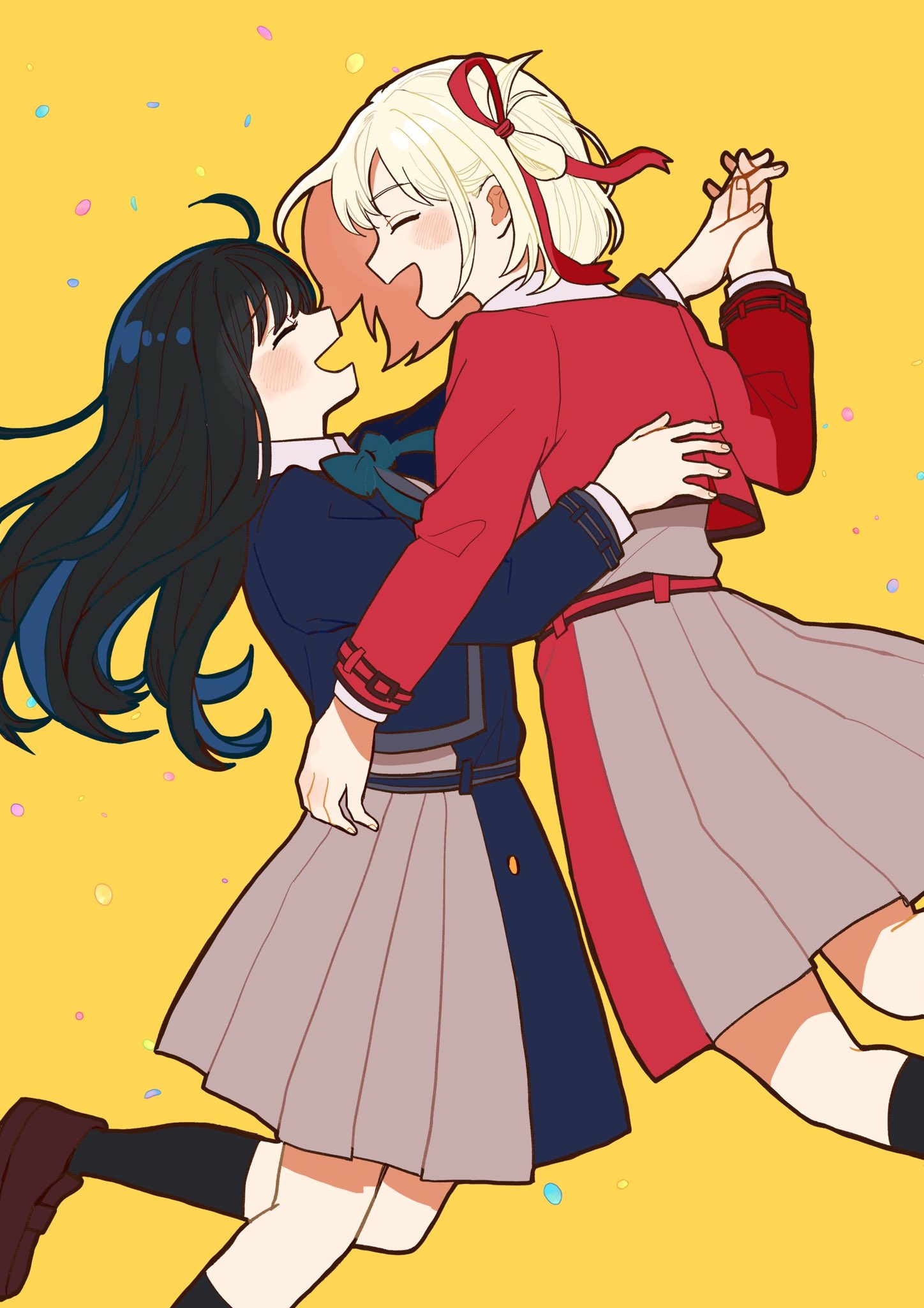 2girls ^_^ bad_id bad_twitter_id belt black_hair black_socks blonde_hair blue_belt blue_dress blush bob_cut brown_footwear closed_eyes commentary_request confetti dress face-to-face facing_another from_side green_ribbon grey_dress hair_ribbon highres holding_hands inoue_takina interlocked_fingers kuro_gomaa loafers long_hair long_sleeves lycoris_recoil lycoris_uniform multiple_girls neck_ribbon nishikigi_chisato open_mouth pleated_dress profile red_belt red_dress red_ribbon ribbon shoes short_hair simple_background smile socks standing standing_on_one_leg two-tone_dress yellow_background