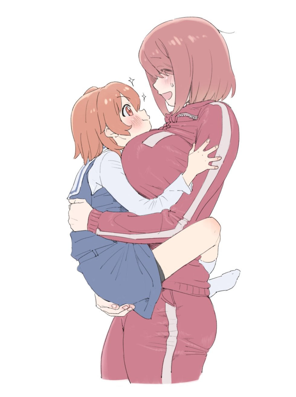 2girls between_breasts blush breasts closed_mouth embarrassed head_between_breasts highres holding hoshino_hinata hoshino_miyako_(wataten) hug jacket large_breasts looking_at_another multiple_girls open_mouth qopqop school_uniform short_hair siblings simple_background smile socks sweatdrop track_jacket track_suit watashi_ni_tenshi_ga_maiorita! white_background