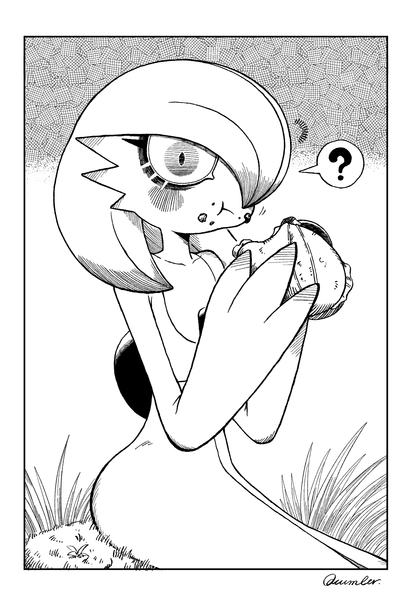 1girl :t ? artist_name blush bob_cut border cheek_bulge chewing closed_mouth collarbone crumbs cucumber_(wanton9cum) eating female_focus flat_chest food food_on_face gardevoir gen_3_pokemon grass greyscale hair_over_one_eye hands_up highres holding holding_food holding_sandwich looking_at_viewer monochrome nintendo notice_lines on_ground one_eye_covered outdoors pokemon pokemon_(creature) sandwich short_hair signature sitting solo submarine_sandwich white_border