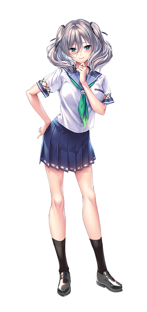 1girl amakano_2 black_shoes black_socks blue_eyes blue_sailor_collar blue_skirt blush breasts closed_mouth female_pubic_hair full_body green_neckerchief green_necktie grey_hair grin hair_between_eyes hand_on_own_chin hand_on_own_hip large_breasts loafers looking_at_viewer neckerchief necktie non-web_source piromizu pleated_skirt pubic_hair sailor_collar jigokudani_sara school_uniform serafuku shirt shoes simple_background skirt smile socks solo standing transparent twintails white_background white_shirt