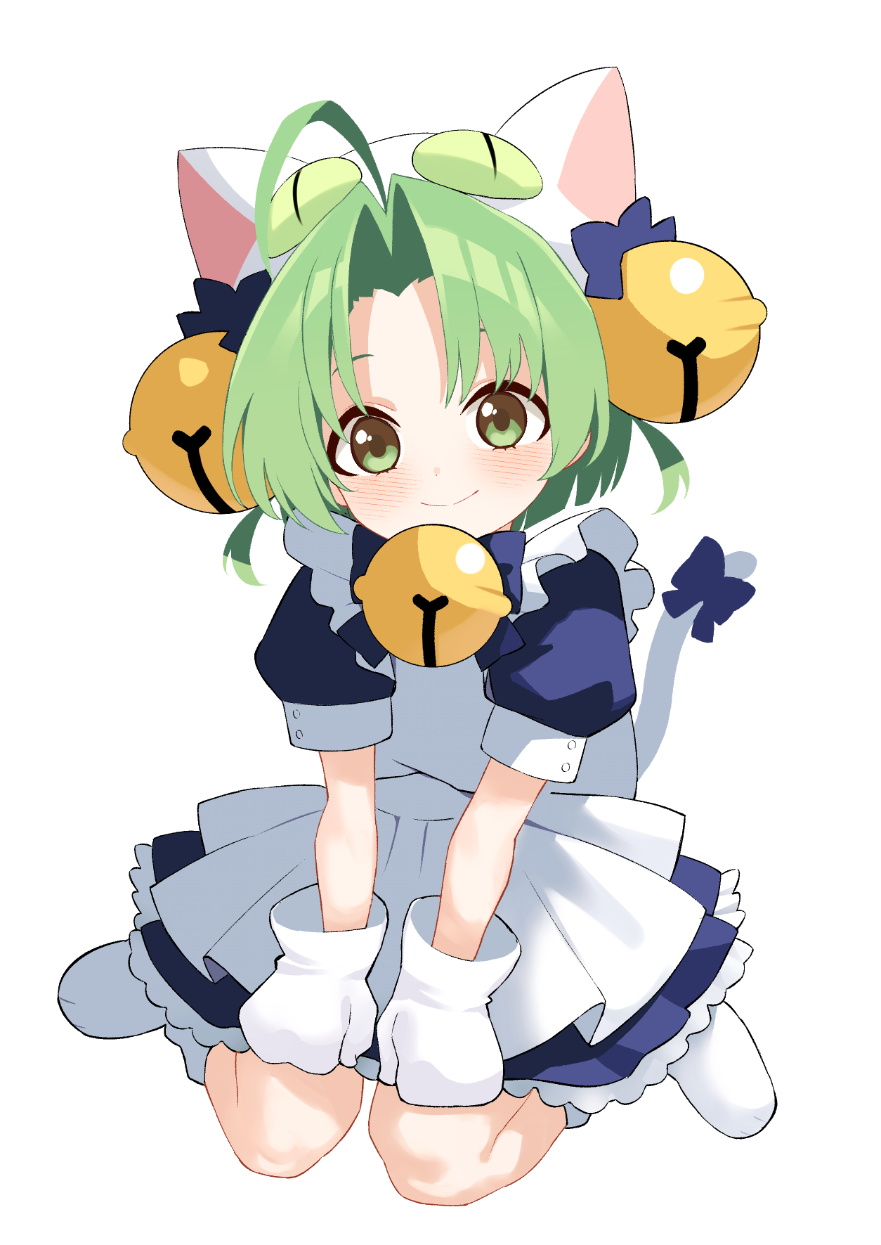1girl ahoge animal_hat apron bell blue_bow blue_bowtie blue_dress bow bowtie cat_girl cat_hat cat_tail closed_mouth commentary_request dejiko di_gi_charat dress full_body green_eyes green_hair hair_bell hair_bow hair_ornament hat highres invisible_chair jingle_bell looking_at_viewer medium_hair mittens neck_bell odaneru_apart parted_bangs puffy_short_sleeves puffy_sleeves short_sleeves simple_background sitting smile solo tail tail_bow tail_ornament two_side_up wariza white_apron white_background white_footwear white_hat white_mittens