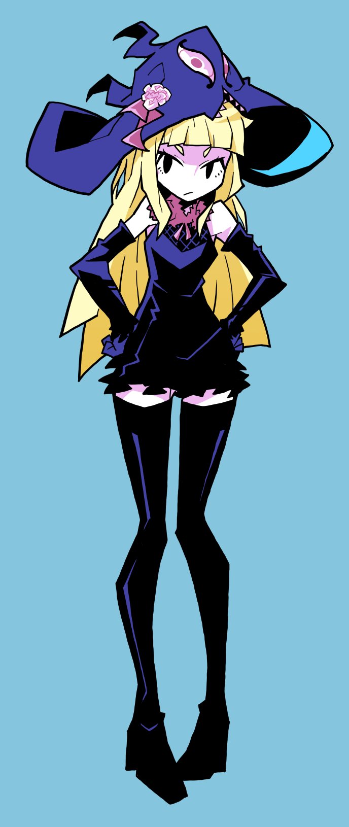 1girl akableak black_boots black_dress black_eyes black_gloves blonde_hair blue_background blue_hat boots dress elbow_gloves frown full_body gloves hat highres long_hair looking_to_the_side original simple_background sleeveless sleeveless_dress solo thigh_boots v-shaped_eyebrows very_long_hair witch_hat