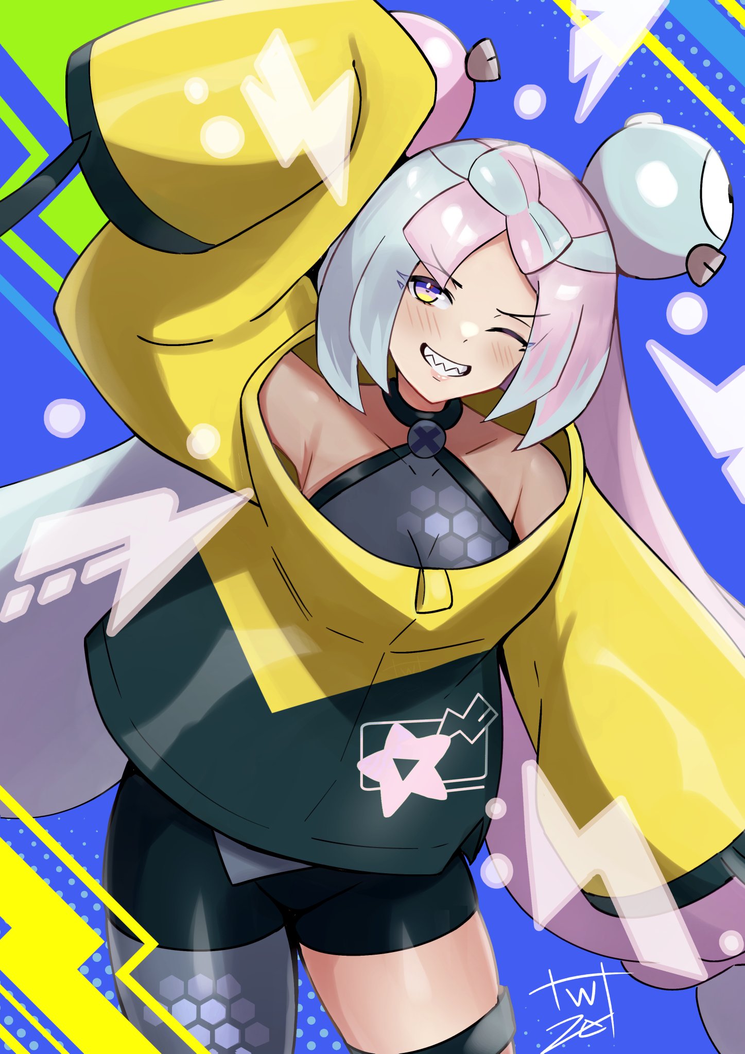 1girl bare_shoulders blue_hair bow-shaped_hair breasts character_hair_ornament gen_1_pokemon grey_pantyhose hair_ornament hand_up hexagon_print highres iono_(pokemon) jacket long_hair low-tied_long_hair magnemite medium_breasts multicolored_hair nintendo one_eye_closed oversized_clothes pantyhose pink_hair pokemon pokemon_sv sharp_teeth single_leg_pantyhose sleeveless sleeves_past_fingers sleeves_past_wrists smile solo split-color_hair teeth x_(symbol) yellow_jacket zet_(twt_zet)