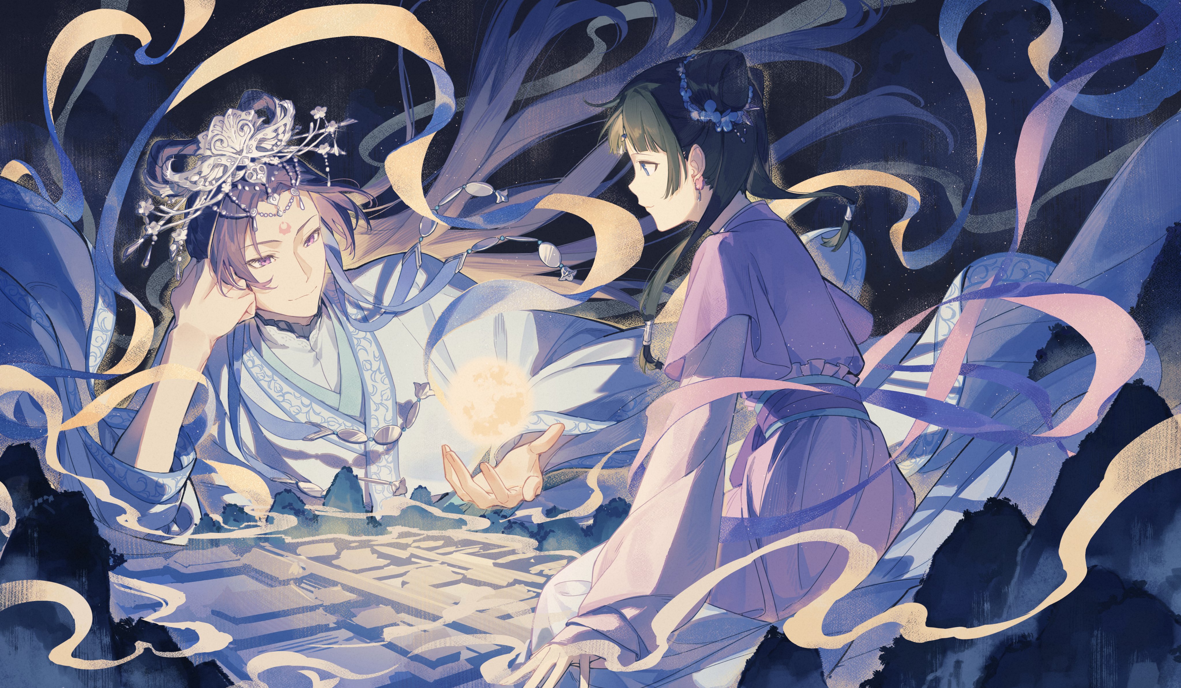 1boy 1girl absurdres androgynous aoqun blue_eyes blue_hanfu blue_robe blunt_bangs chinese_clothes closed_mouth commentary cone_hair_bun crossdressing double_bun dress earrings facial_mark feet_out_of_frame feixianji_(hairstyle) floating_clothes floating_hair flower flower_earrings forehead_mark full_moon glowing green_hair hagoromo hair_bun hair_flower hair_ornament hair_rings hair_stick hanfu head_chain head_rest headdress highres holding_moon huadian jewelry jinshi_(kusuriya_no_hitorigoto) kusuriya_no_hitorigoto light_particles long_hair long_sleeves looking_at_another lying maomao_(kusuriya_no_hitorigoto) moon mountain object_floating_above_hand official_alternate_costume on_side parted_bangs pink_dress pink_shawl purple_eyes purple_hair robe shawl sitting smile untranslatable_commentary tsubsa_syaoin twintails very_long_hair wide_sleeves yellow_shawl