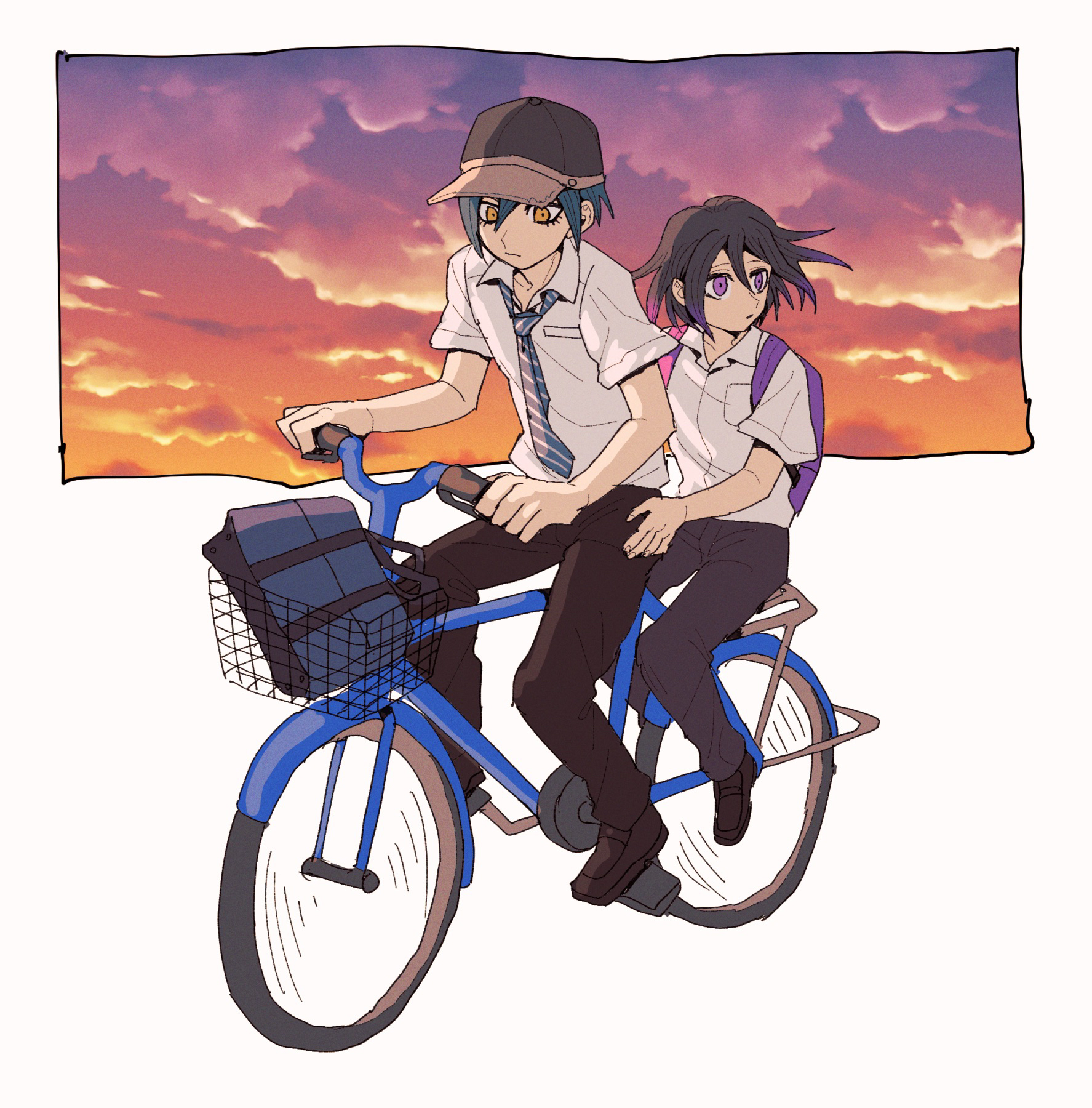 2boys bicycle black_hair blue_hair buttons cloud cloudy_sky collared_shirt danganronpa_(series) danganronpa_v3:_killing_harmony esu_(tasoesu) evening gradient_sky hair_between_eyes hands_on_another's_hips highres male_focus multiple_boys necktie oma_kokichi pants purple_eyes purple_hair riding riding_bicycle saihara_shuichi school_uniform shirt short_hair simple_background sky striped_clothes striped_necktie white_shirt yellow_eyes