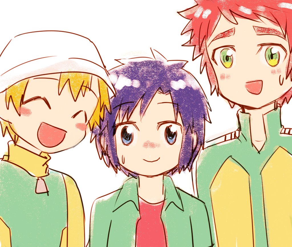 3boys appmon artist_request blonde_hair blue_hair blush bucket_hat closed_eyes digimon digimon_adventure_02 digimon_frontier digimon_universe:_appli_monsters green_eyes hat kimura_kouichi multiple_boys open_mouth ozora_yujin red_hair short_hair simple_background smile tagme takaishi_takeru white_background