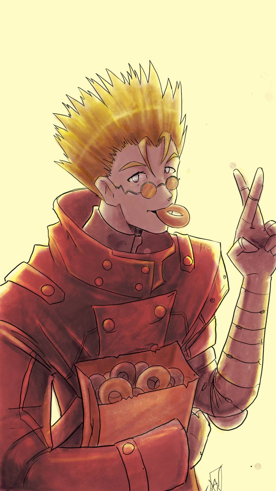 1boy blonde_hair coat donut food high_collar highres orange-tinted_eyewear prosthesis prosthetic_arm red_coat round_eyewear solo spiked_hair tinted_eyewear trigun undercut v vash_the_stampede will_mangin