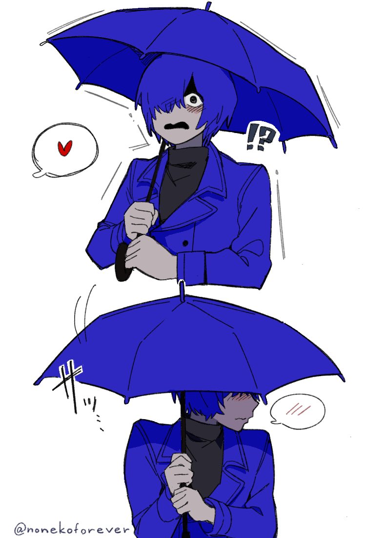 1boy alternate_color black_eyes blue_coat blue_hair blue_umbrella blush coat commentary_request hair_over_one_eye holding holding_umbrella homicipher male_focus mr._scarletella nonekoforever player_2 short_hair simple_background umbrella white_background