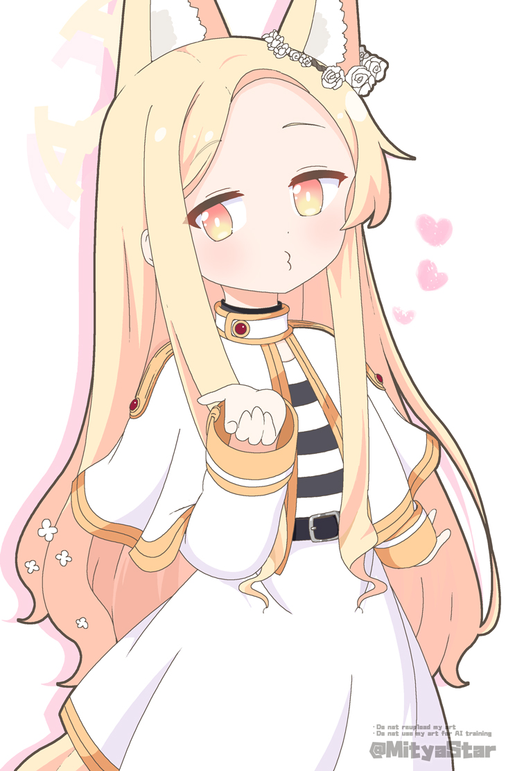 1girl animal_ears artist_name blonde_hair blowing_kiss blue_archive capelet commentary_request cosplay dress fox_ears fox_girl frieren frieren_(cosplay) gradient_eyes halo heart long_hair long_sleeves looking_at_viewer mitya multicolored_eyes orange_eyes revision seia_(blue_archive) shirt simple_background solo sousou_no_frieren striped_clothes striped_shirt tanezaki_atsumi voice_actor_connection white_background white_capelet white_dress yellow_halo