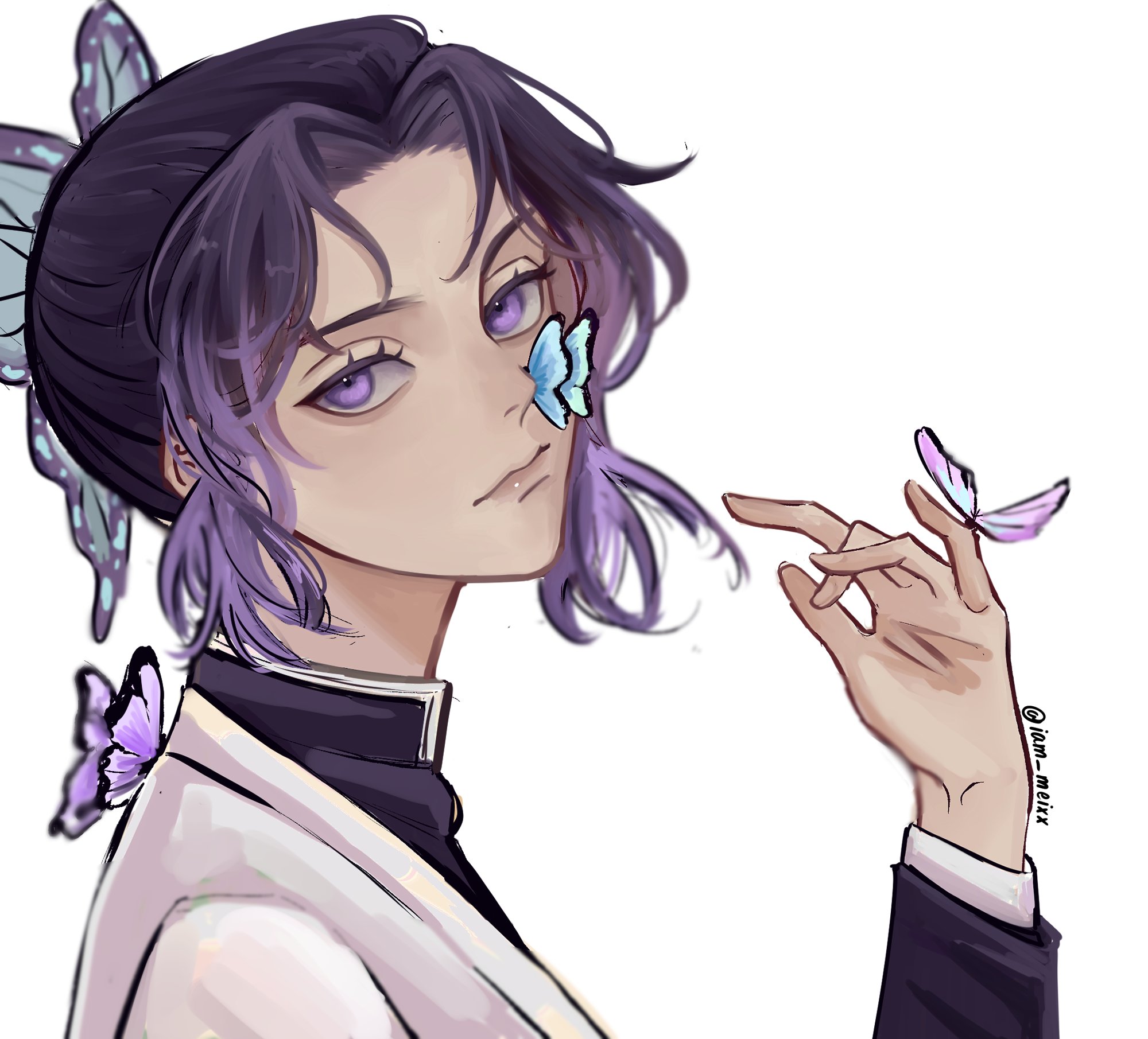 1girl blue_butterfly bug butterfly butterfly_hair_ornament closed_mouth commentary hair_bun hair_ornament haori highres iameixx insect japanese_clothes kimetsu_no_yaiba kochou_shinobu long_sleeves looking_at_viewer purple_butterfly purple_eyes purple_hair sidelocks simple_background solo upper_body white_background
